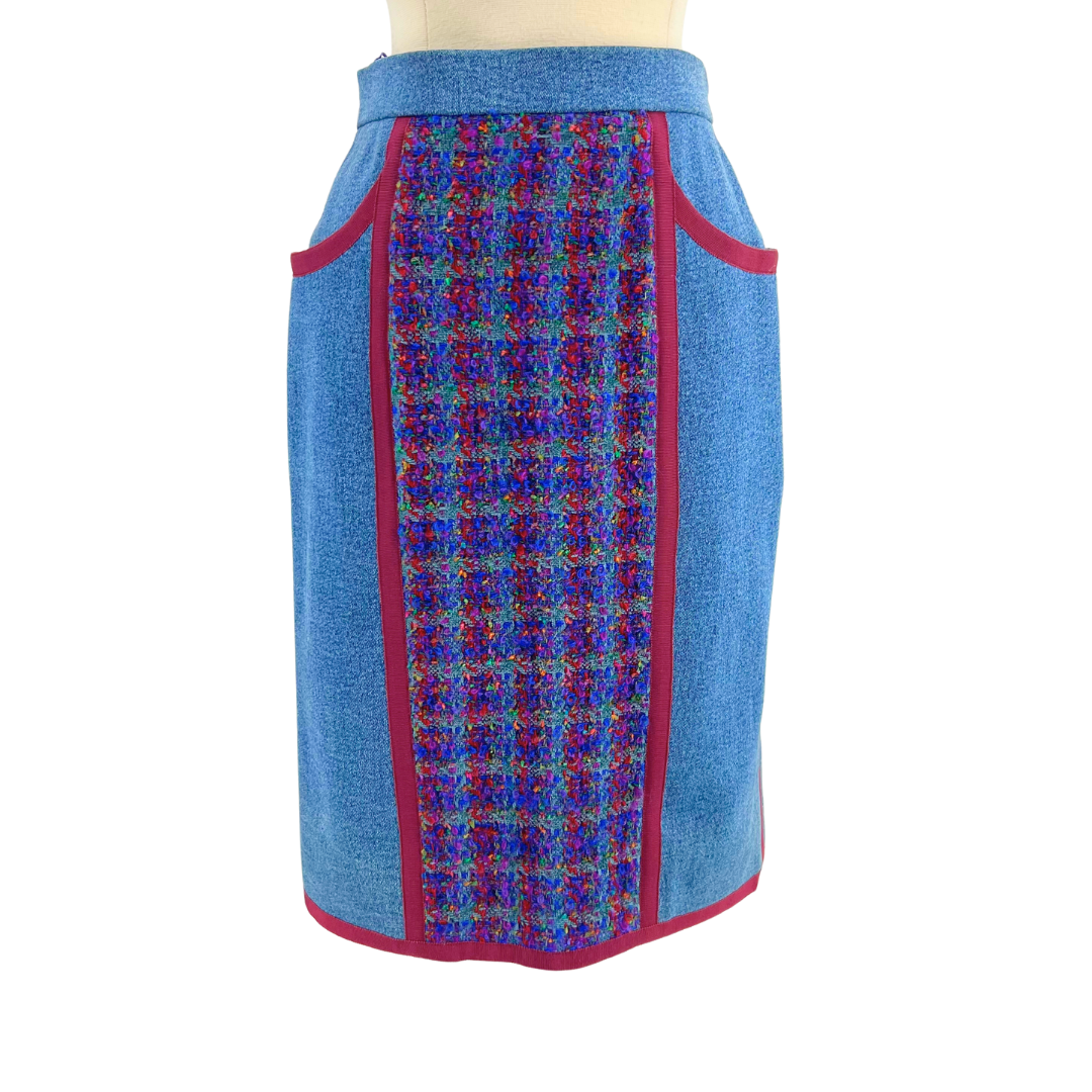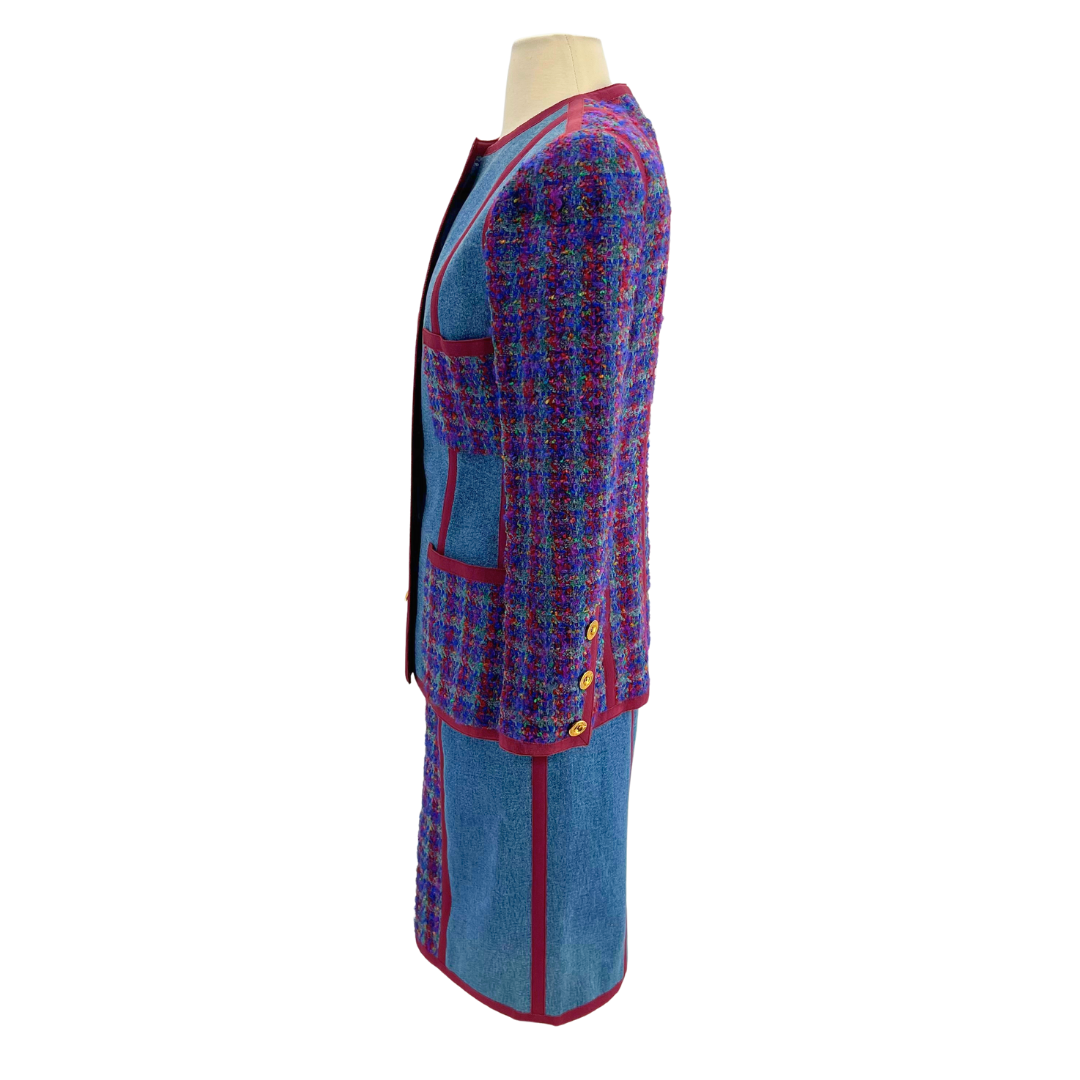 This Chanel Blue/Burgundy Suit by Karl Lagerfeld from 1991 fits like a size 4, blending vintage elegance with precise tailoring for a refined silhouette.
