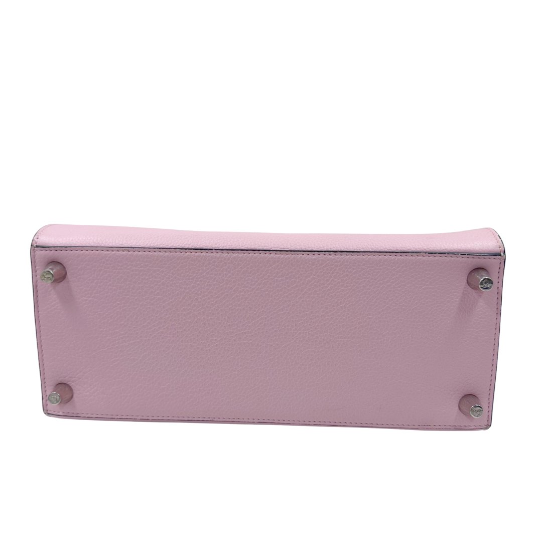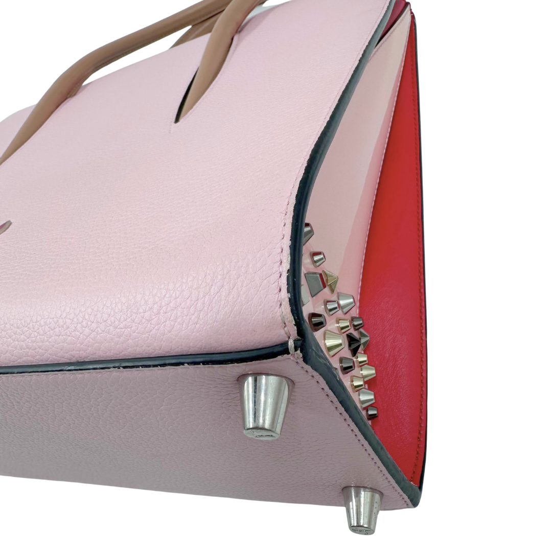 The Christian Louboutin Paloma Bag combines pink and red leather with gold and gunmetal hardware accents. It features a taupe leather top handle and protective feet on the bottom for durability and style.