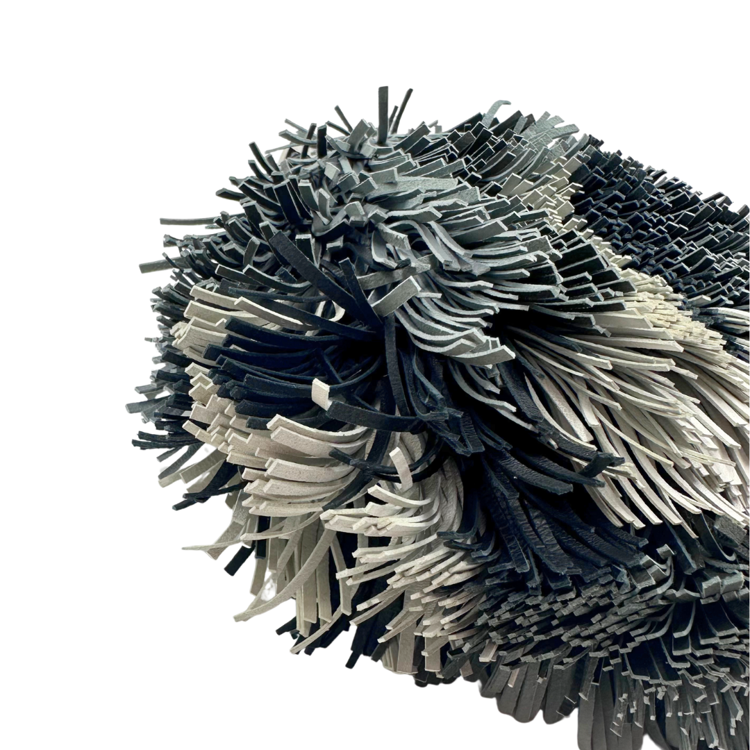 This Fendi leather baguette showcases multi-color fringed detailing set against a sleek black leather base. Silver hardware accents its refined magnetic closure, while the leather-lined interior ensures durability and a luxurious feel.