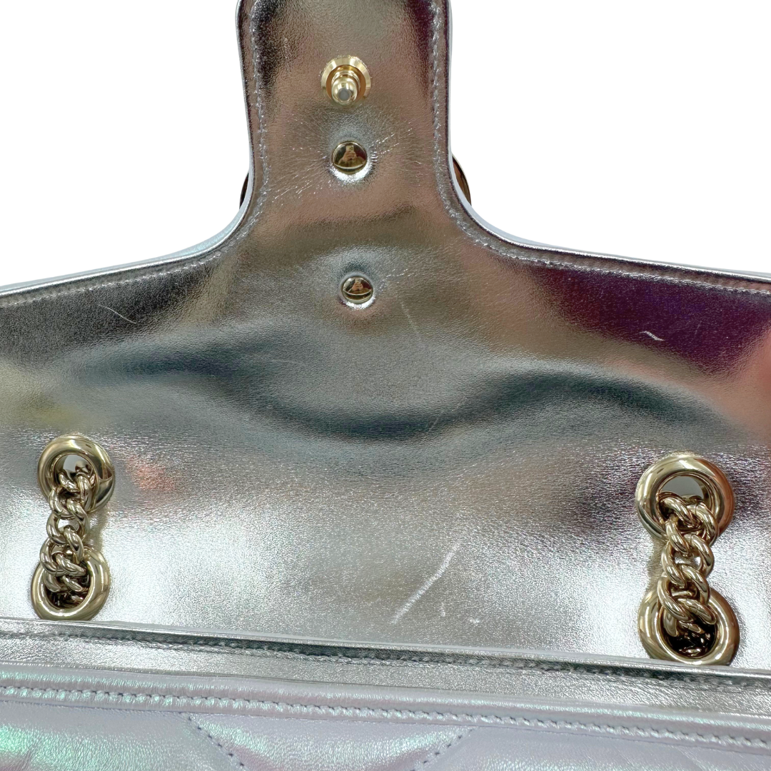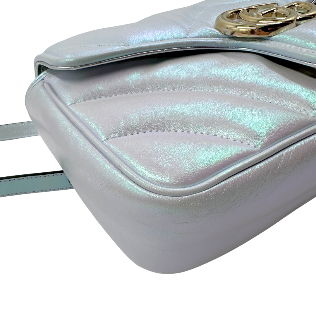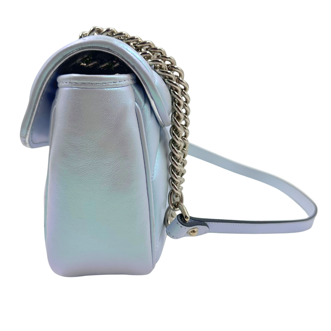 This Gucci bag features iridescent leather with gold Marmont hardware. It includes a chain strap and push lock closure, combining elegance with secure functionality.