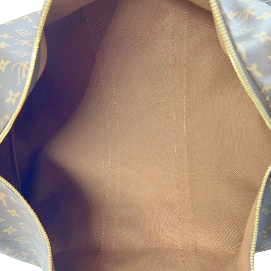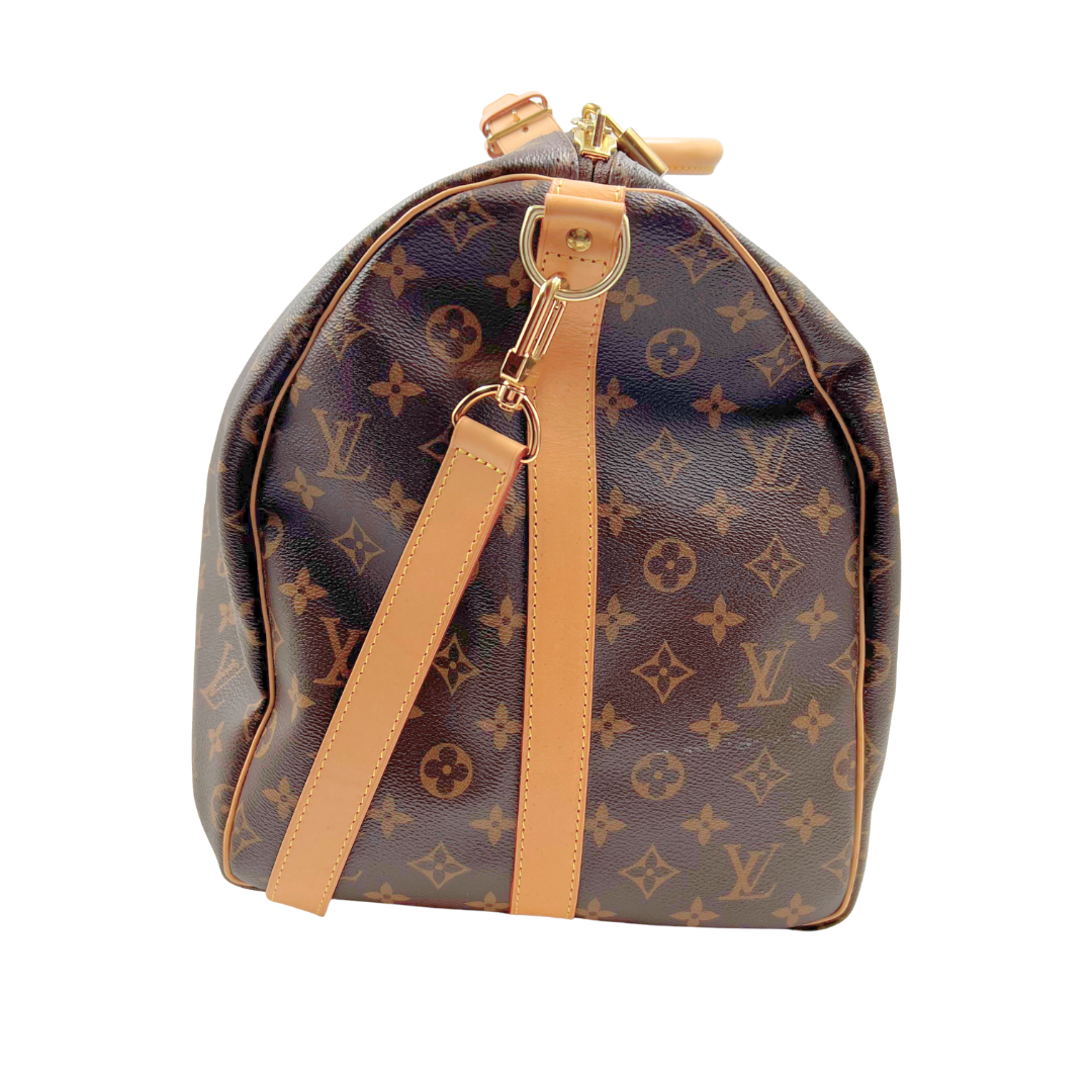 The Keepall Bandoulière 55 is a travel essential crafted from Louis Vuitton's signature monogram canvas. This spacious duffel accommodates weekend getaways with ease, featuring a sturdy leather handle and adjustable shoulder strap for versatile carrying. Note: Lock present without key.