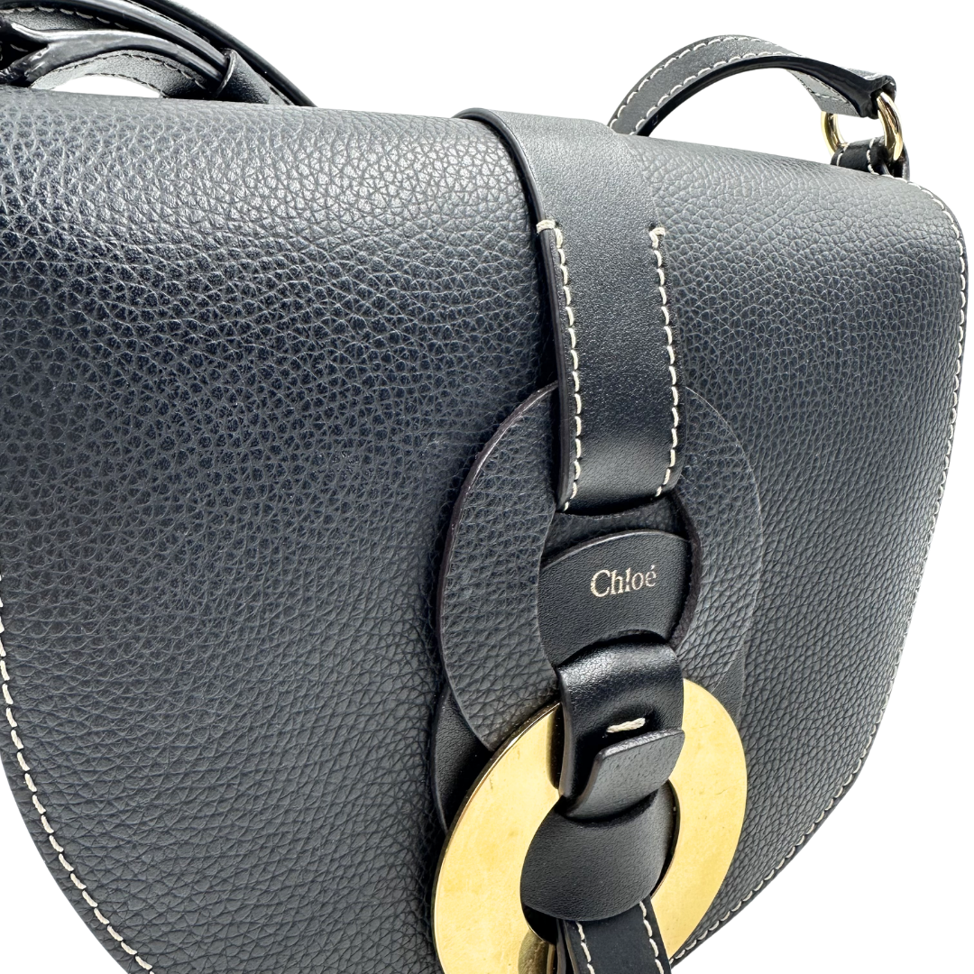 Elegant Chloe crossbody in supple black leather, featuring lustrous gold hardware and a secure magnetic closure. The open back pocket adds convenient access for essentials.