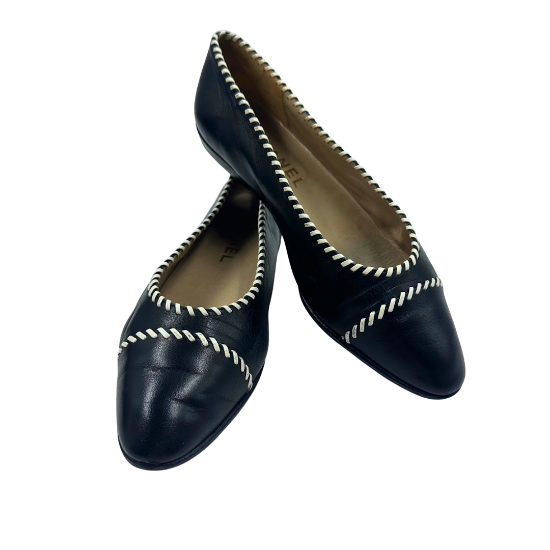 Classic black leather flats elevated with crisp white contrast stitching that adds visual dimension and contemporary flair.