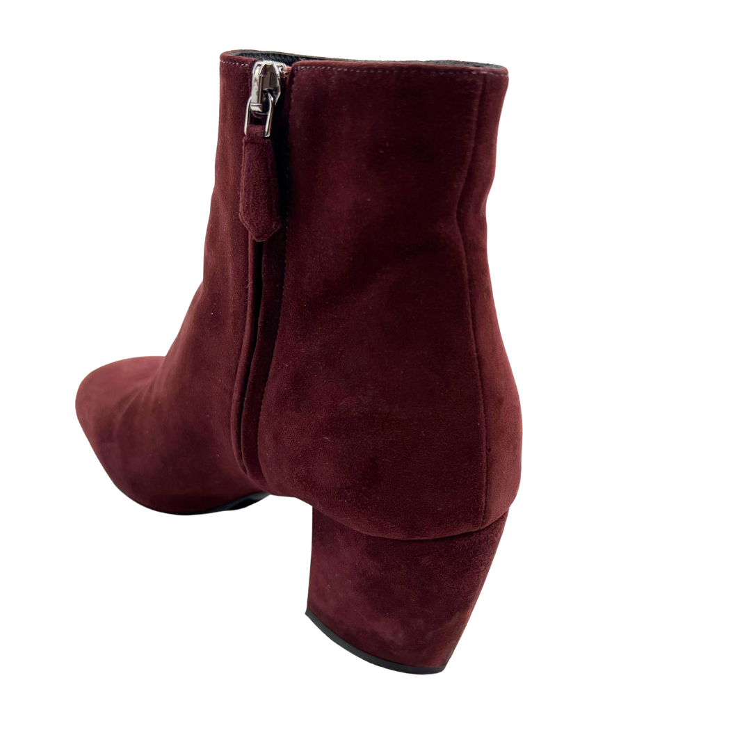 The Prada 35.5 Booties are crafted from burgundy suede with silver hardware. They feature a side zip entry, block heel, and an elegant oval toe for a sophisticated look.