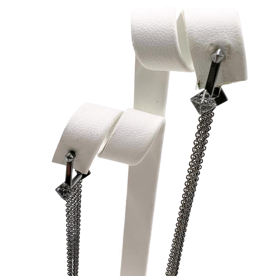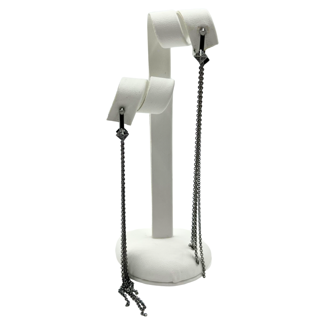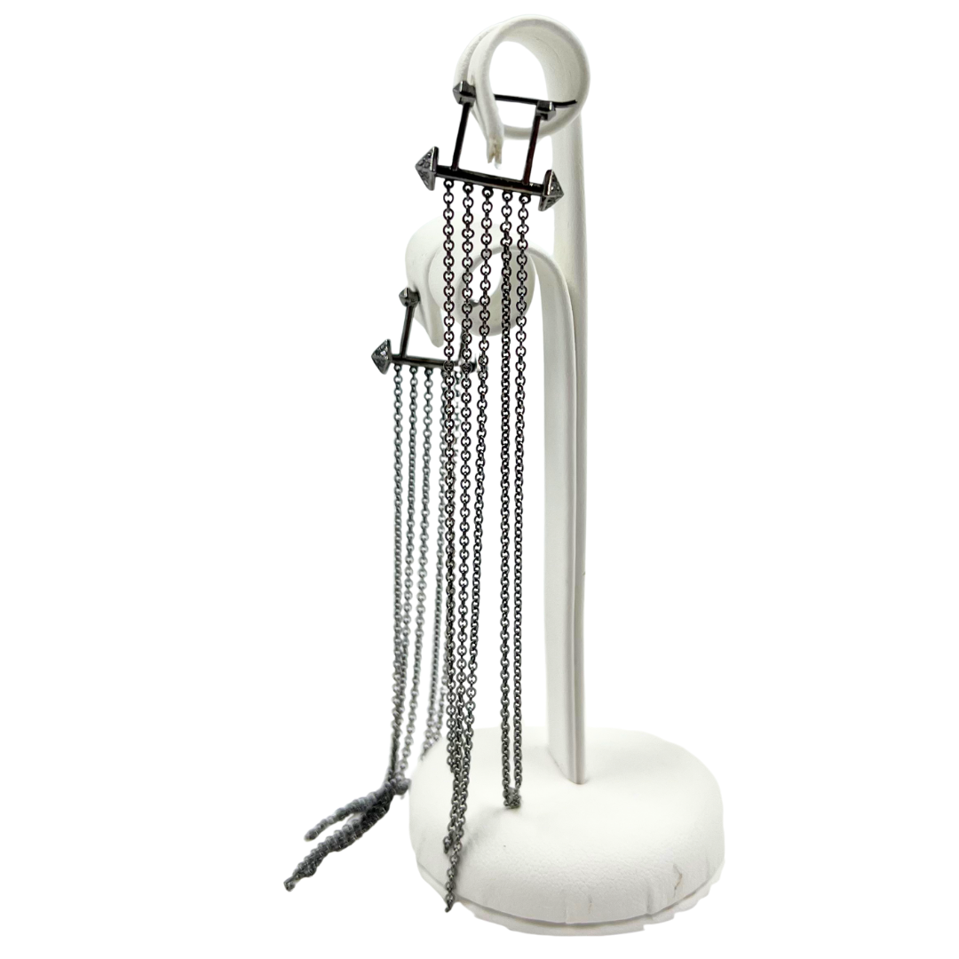 Elevate your everyday look with these sophisticated earrings featuring striking silver gunmetal and black diamond details. Delicate dangle chain elements add movement and visual interest, creating an effortlessly chic aesthetic.