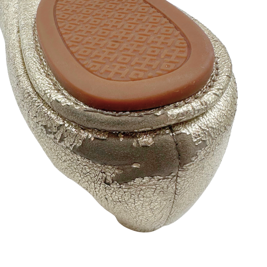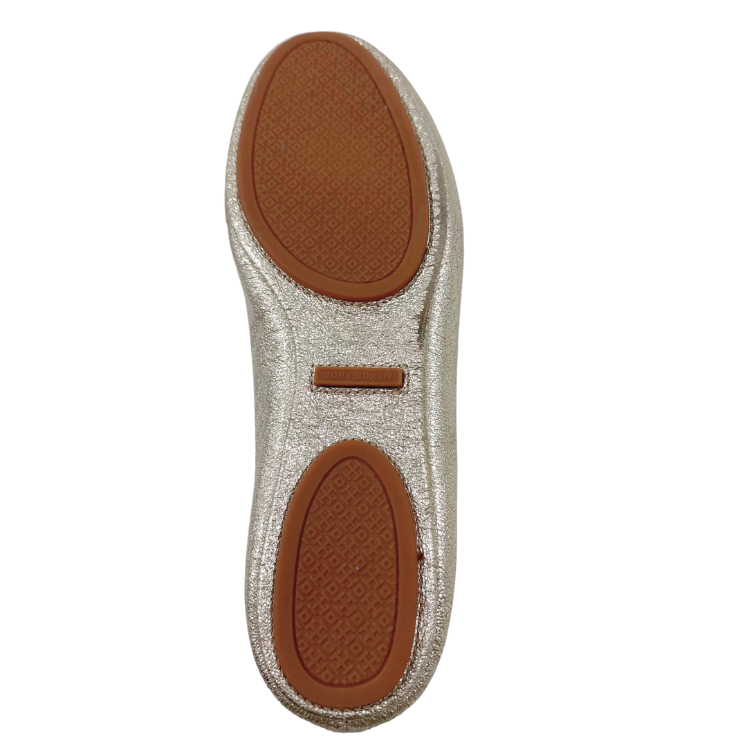 Radiant Tory Burch leather flats in lustrous gold, featuring the iconic TB medallion on the toe and coordinating gold hardware.
