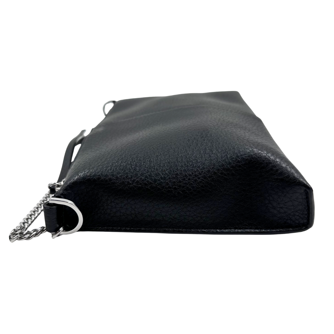 Elevate your everyday carry with this sophisticated All Saints crossbody bag. Crafted from supple black leather, it features polished silver hardware and a delicate silver chain detail that adds refined elegance. The convenient top zip entry keeps your essentials secure while the crossbody silhouette offers hands-free versatility. Perfect for transitioning from day to night, this timeless piece combines classic style with practical functionality.