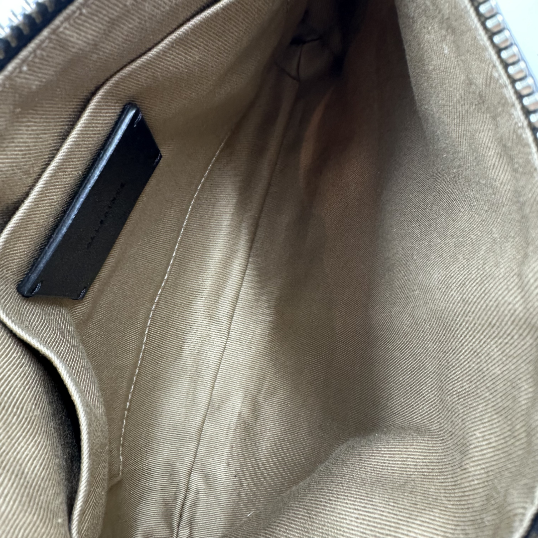 Exterior: Signs of wear can be seen throughout the hardware, leather, and bottom corners.