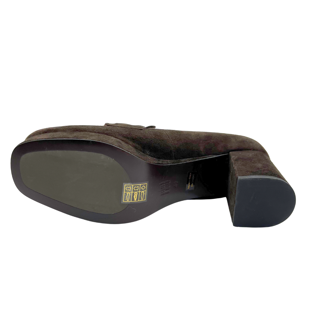 Bibi Lou's brown suede heels in size 10 (40) blend loafer styling with elevated sophistication. The square toe creates a modern silhouette, while gleaming metallic hardware accents add polish and visual interest.