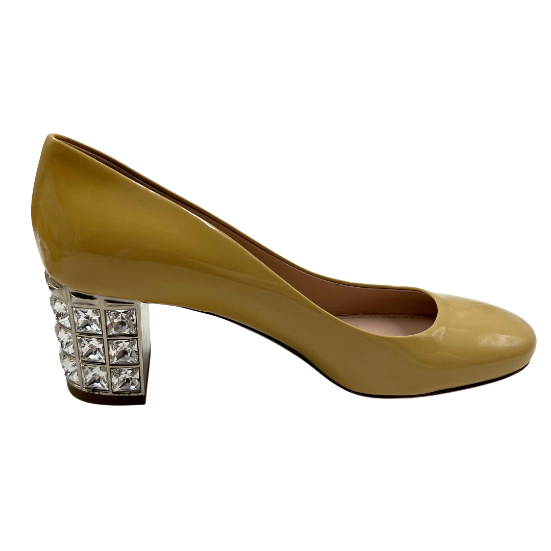 These Miu Miu heels showcase lustrous tan patent leather with a classic round toe silhouette. The sturdy block heel provides comfortable all-day wear, while a sparkling crystal detail elevates the heel for added glamour.