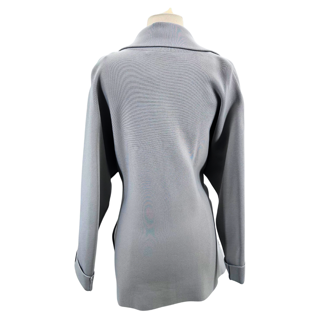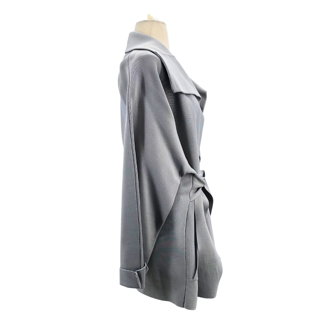 This elegant Adolfo Dominguez grey wrap combines refined style with practical functionality. The adjustable waist tie creates a flattering silhouette, while convenient pockets offer everyday utility. Perfect for layering over dresses or wearing as a standalone piece, this versatile wrap delivers understated sophistication for any occasion.