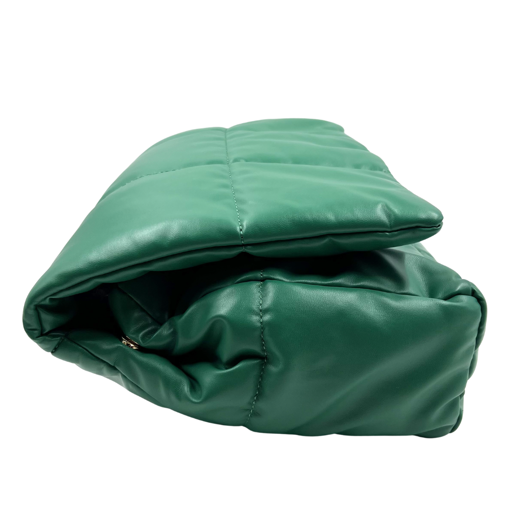This versatile two-way bag features a quilted nylon exterior in a rich green hue, paired with a durable canvas strap for comfortable carrying. The gold-toned hardware and secure magnetic button closure add refined touches to this practical piece.