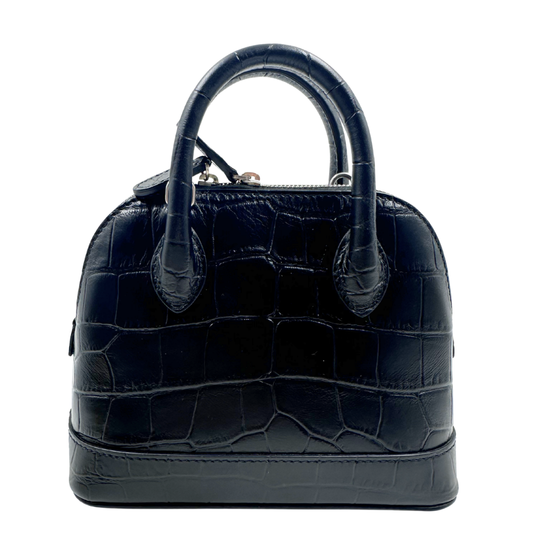 Balenciaga Ville Mini Top Handle in black croc print leather. Features white brand lettering, silver hardware, and a top zip entry for secure closure. Includes a crossbody strap for versatile carrying options alongside the top handle.