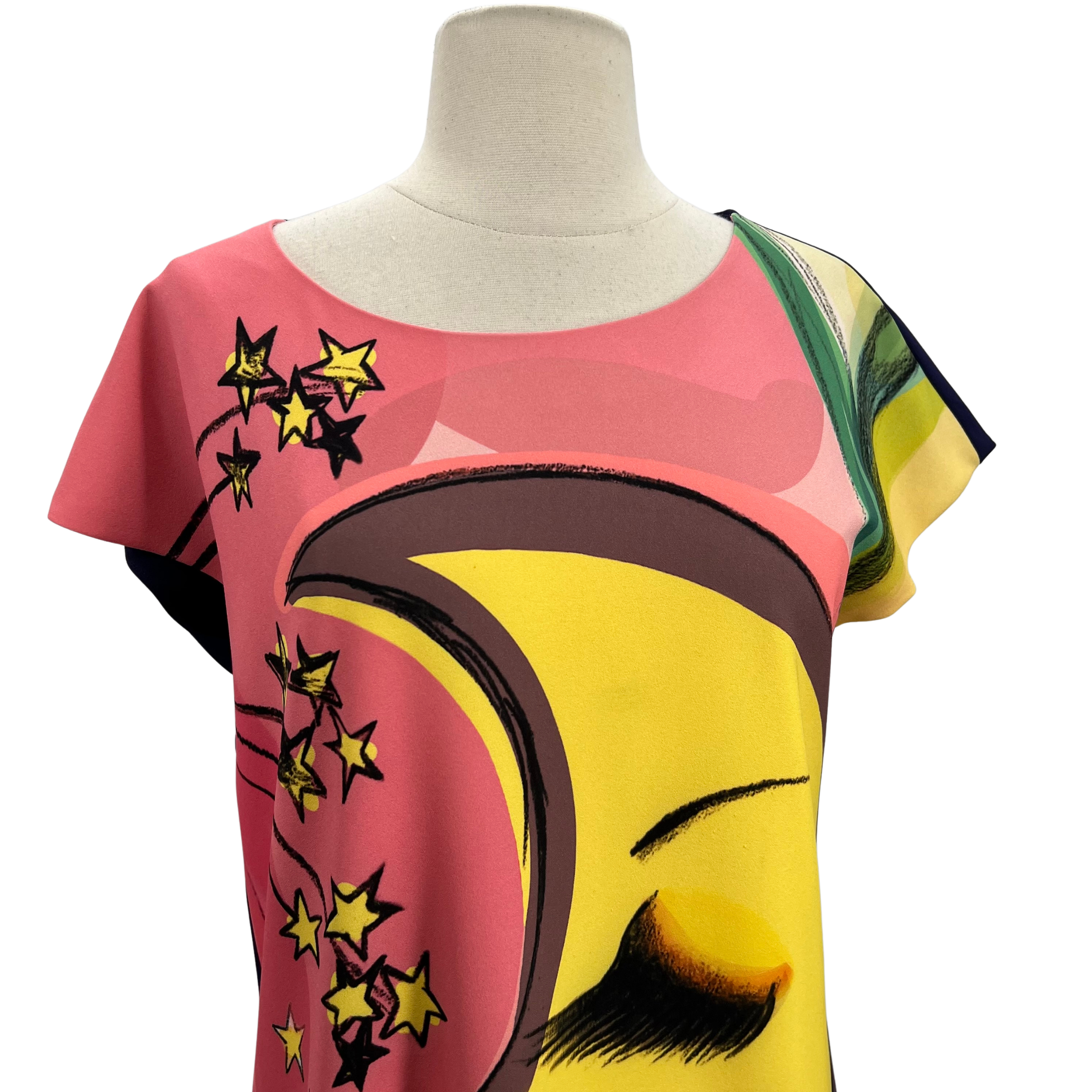 Boutique Moschino tunic in vibrant pink multi featuring an enchanting "Urban Fantasy" design with a celestial moon motif on the front. Size 8, crafted from a comfortable polyester-elastane blend that moves with you. Perfect for layering or wearing solo, this statement piece brings whimsical style to your everyday wardrobe