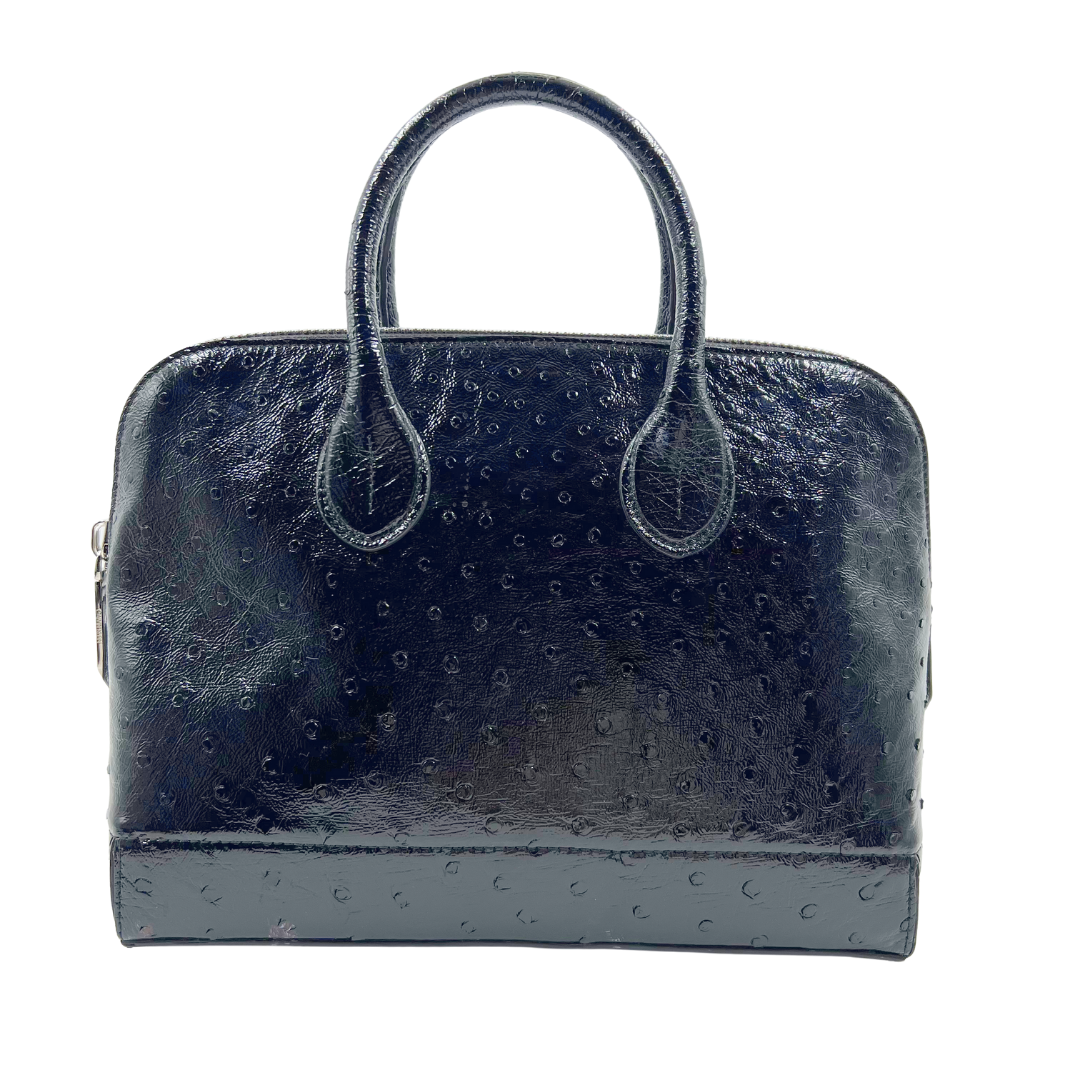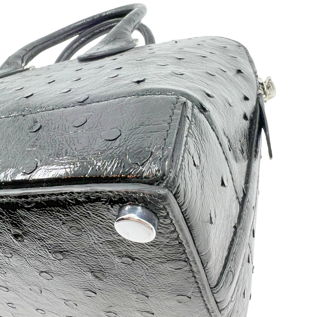 Sophisticated Calvin Klein Collection two-way bag crafted from luxurious black ostrich leather. Features a secure zip closure and polished silver hardware for refined elegance. The detachable crossbody strap, also in ostrich leather, offers versatile styling options for day or evening wear.