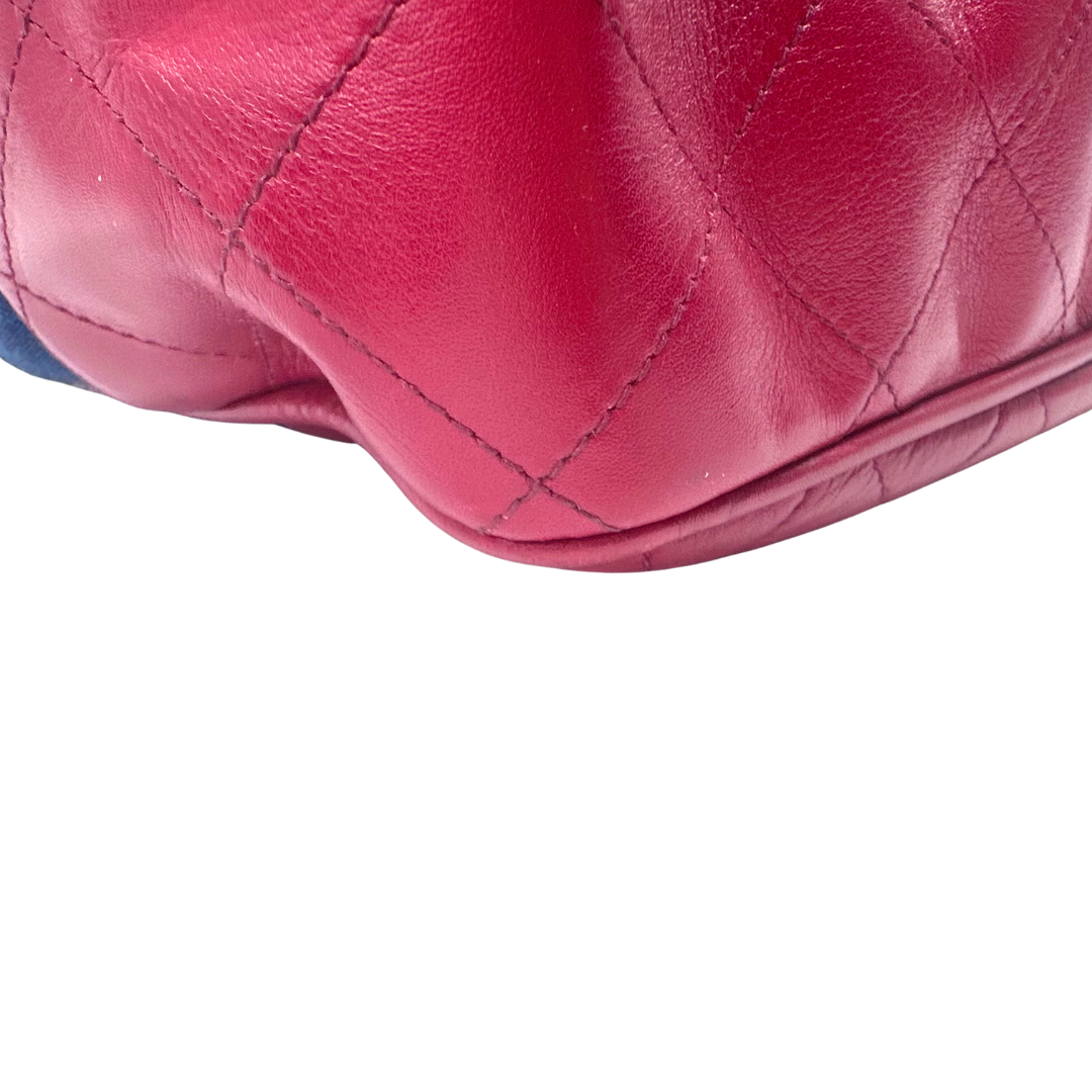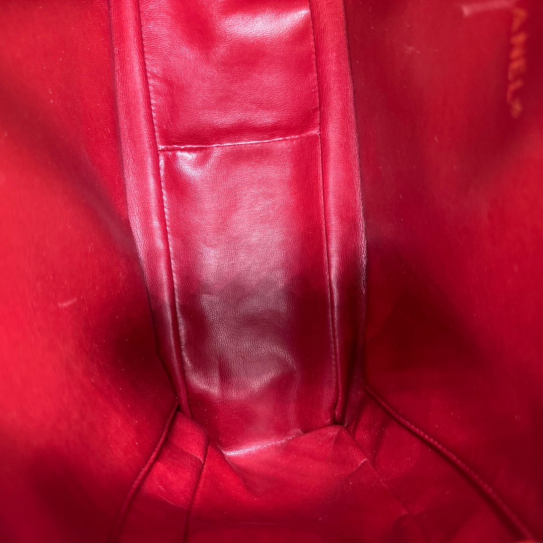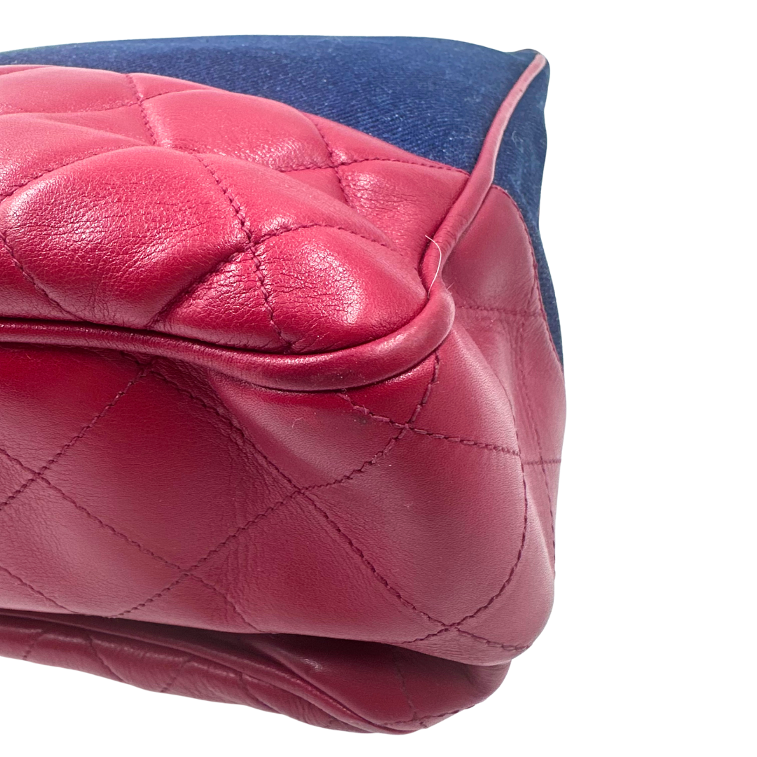 This Chanel Denim Chain Tote merges casual and luxury with its striking blue denim body accented by vibrant red leather details. The iconic CC motif adorns an elegant chain strap finished in gleaming gold hardware, while a secure magnetic closure protects your essentials. The supple leather-lined interior completes this coveted designer piece.