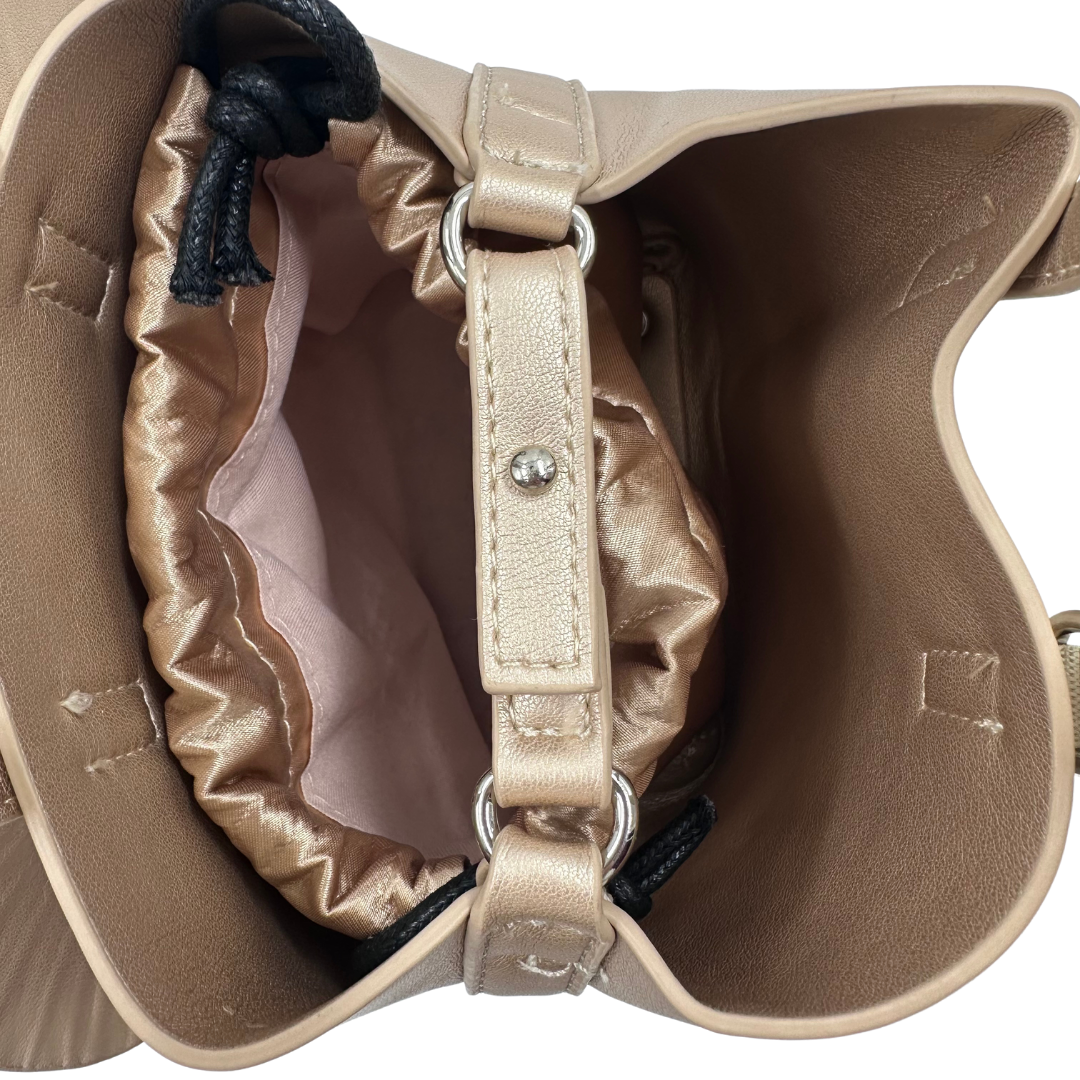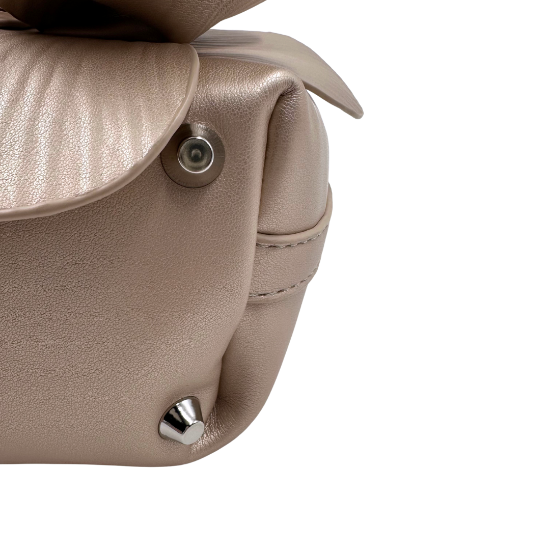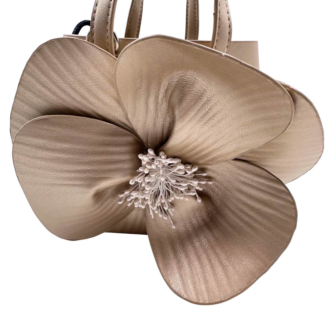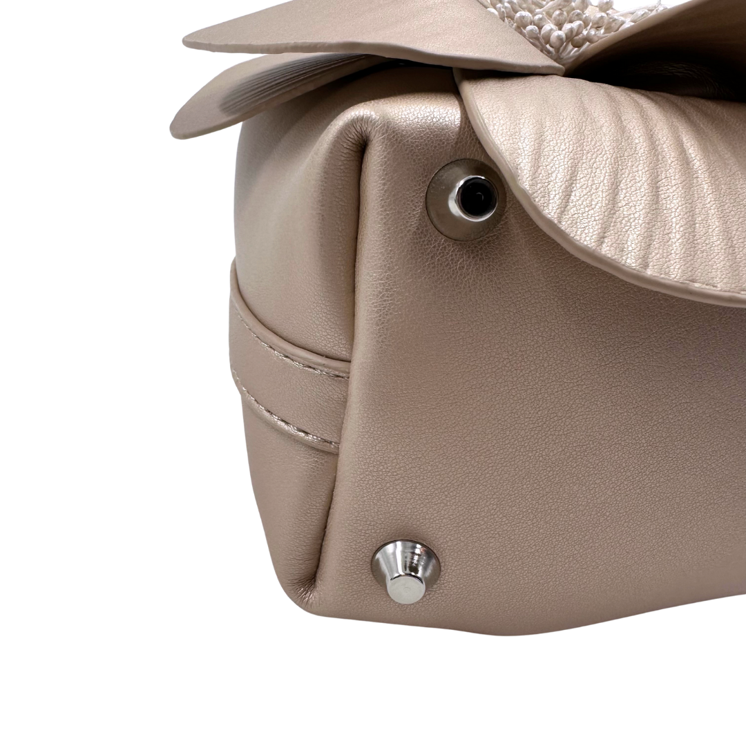 Stylish rose gold faux leather basket bag with polished silver hardware and an elegant flower motif adorning the front. The detachable silver chain strap offers versatile carrying options, allowing you to wear it as a crossbody or shoulder bag.