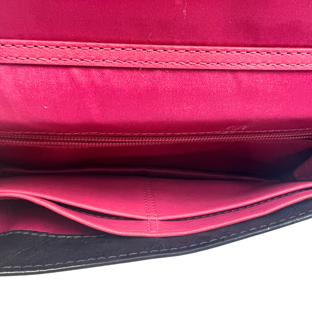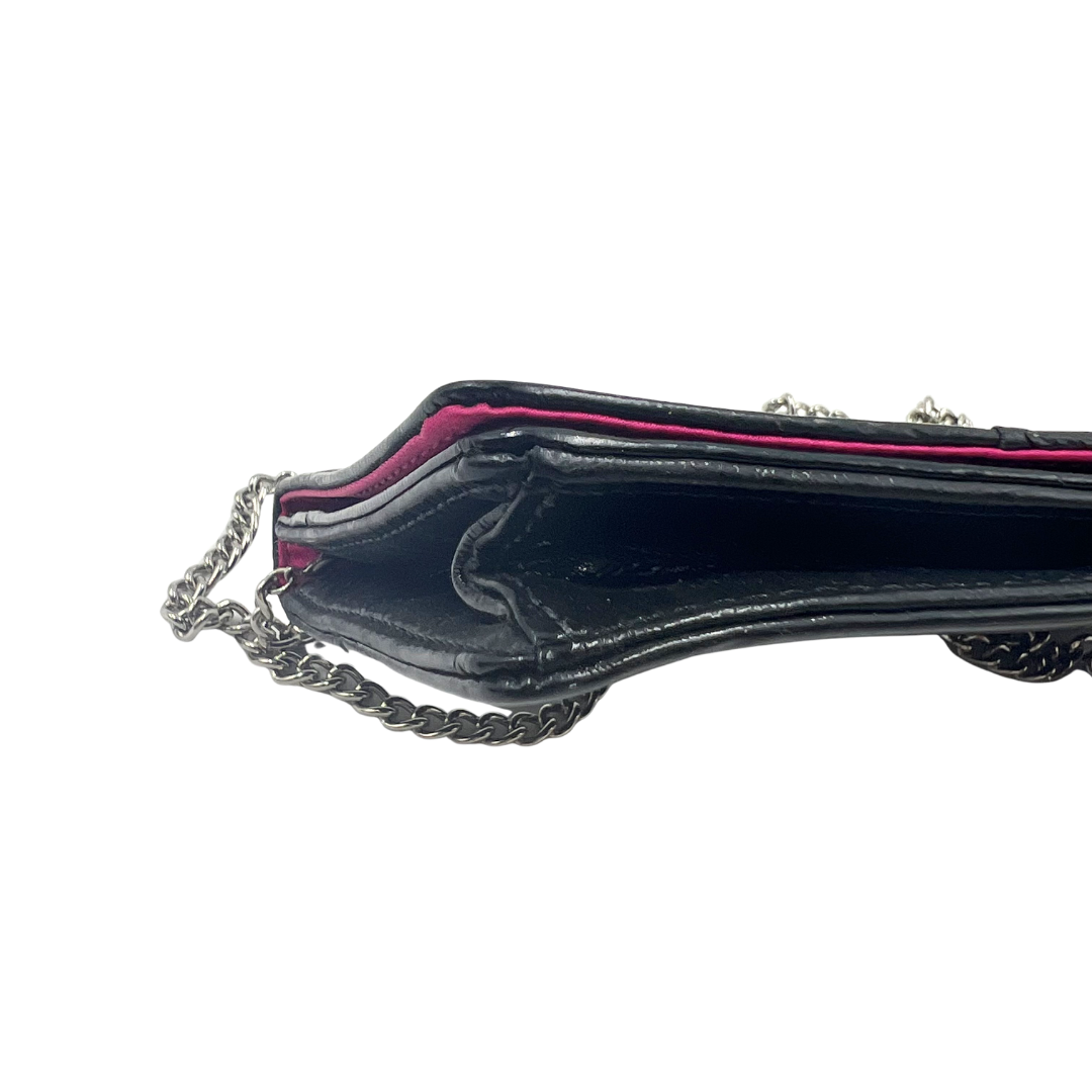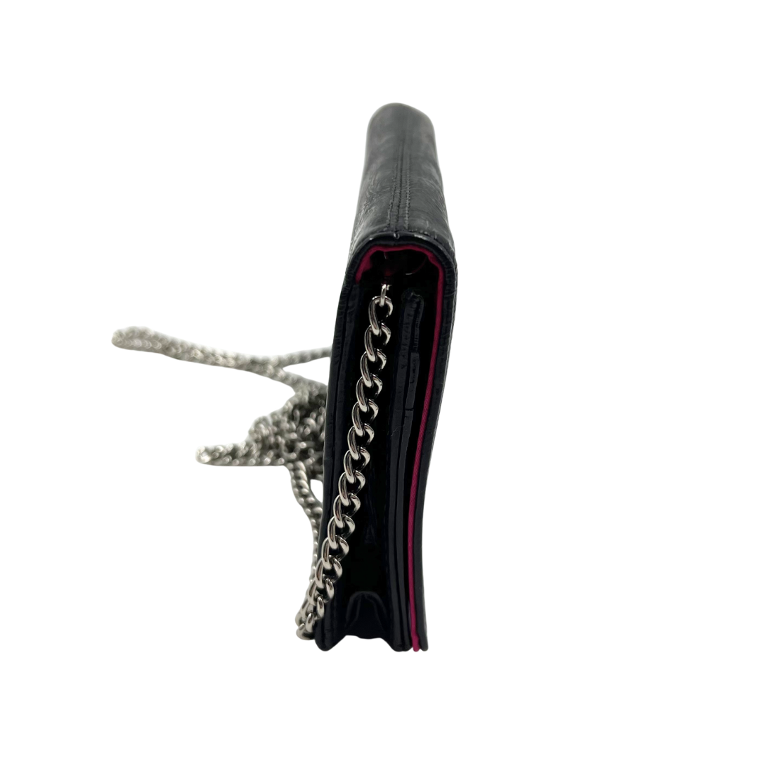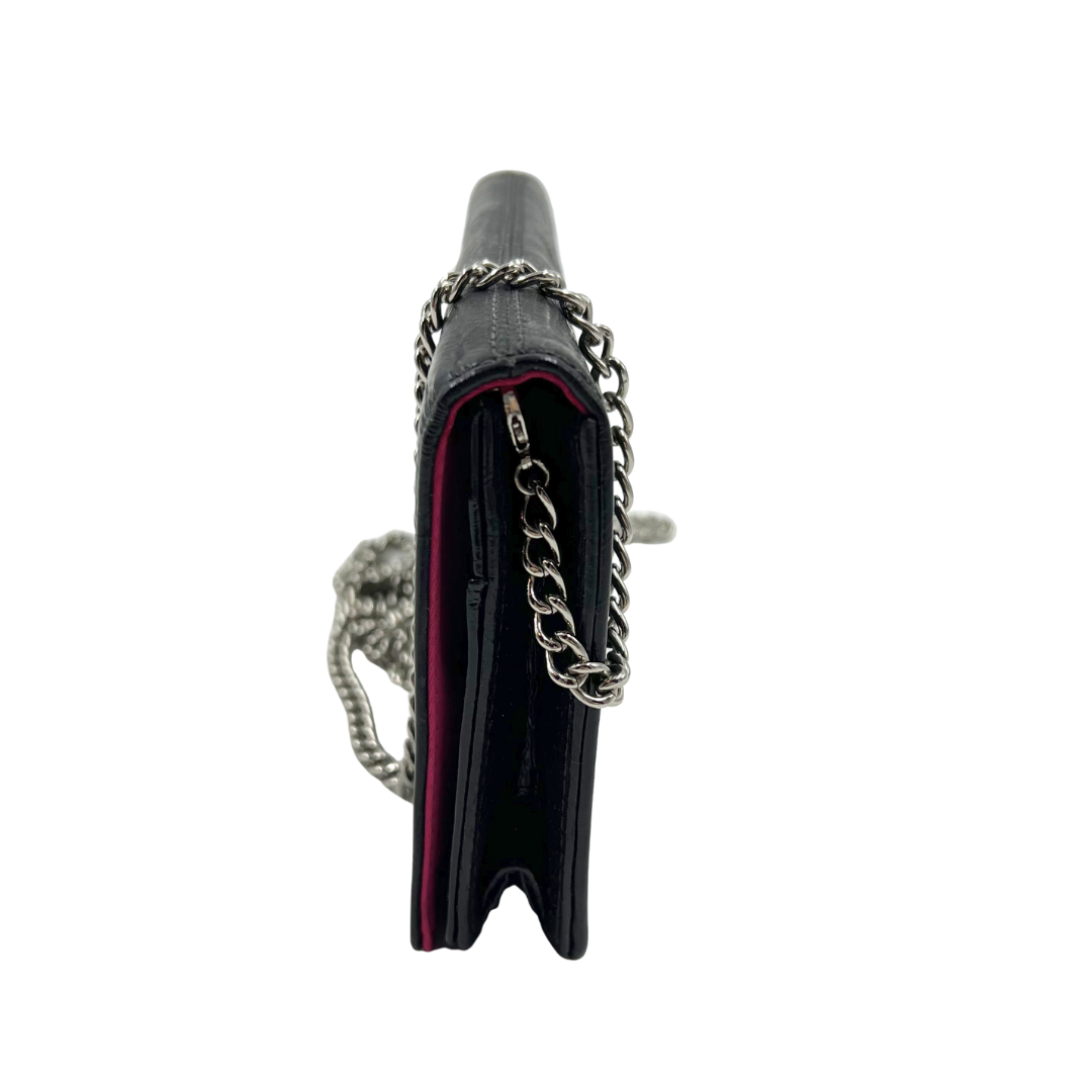Elevate your everyday style with this classic Coach crossbody bag. Crafted in sleek black patent leather, it features a distinctive silver chain strap for effortless shoulder wear. The secure button snap closure keeps your essentials safe, while the charming pink fabric interior adds a pop of personality.