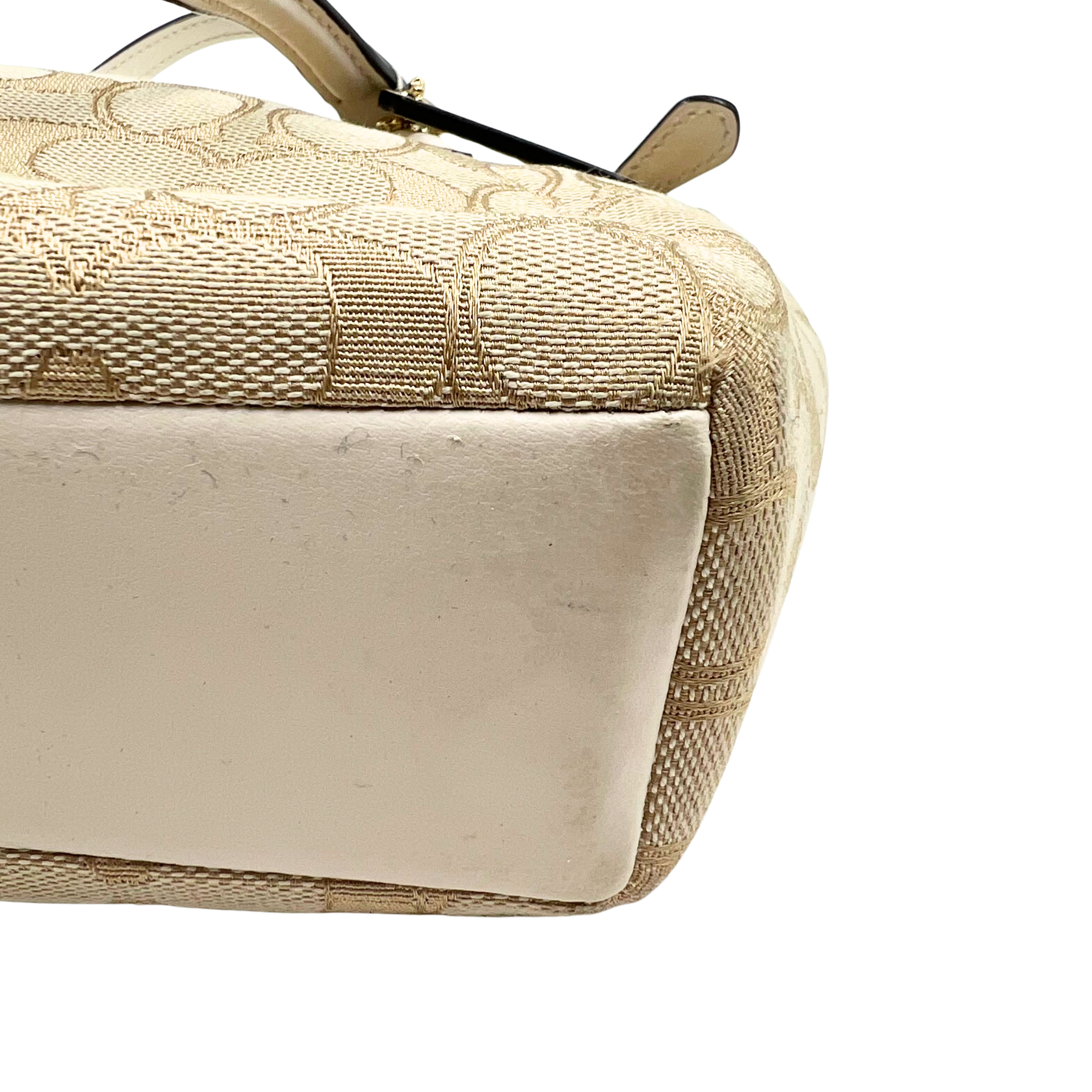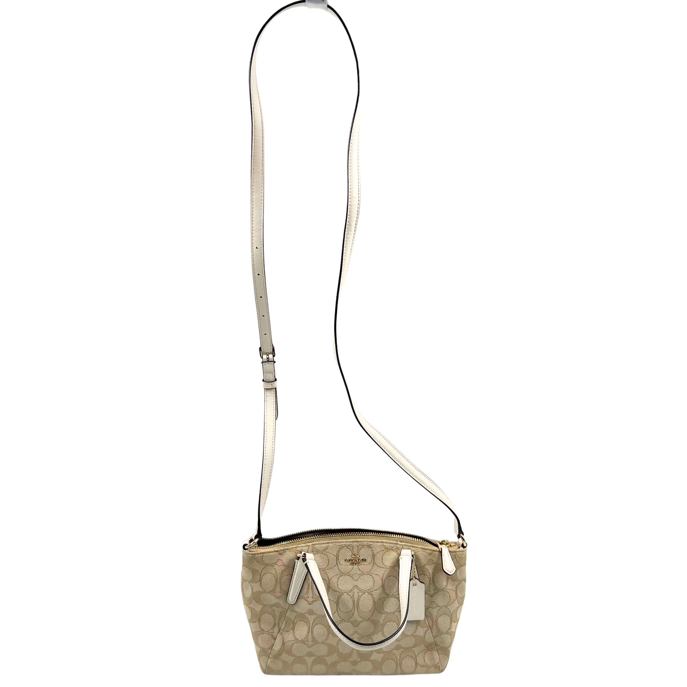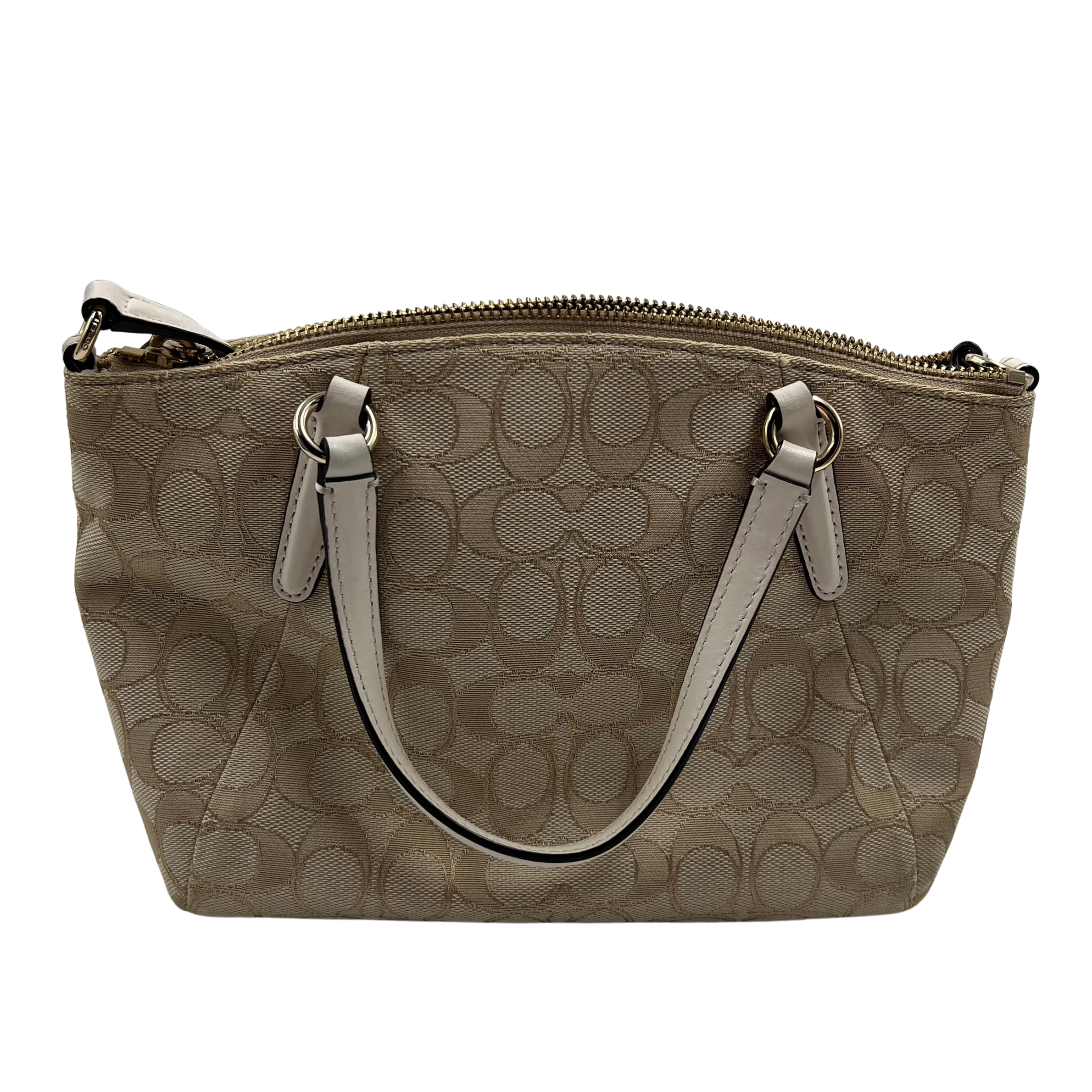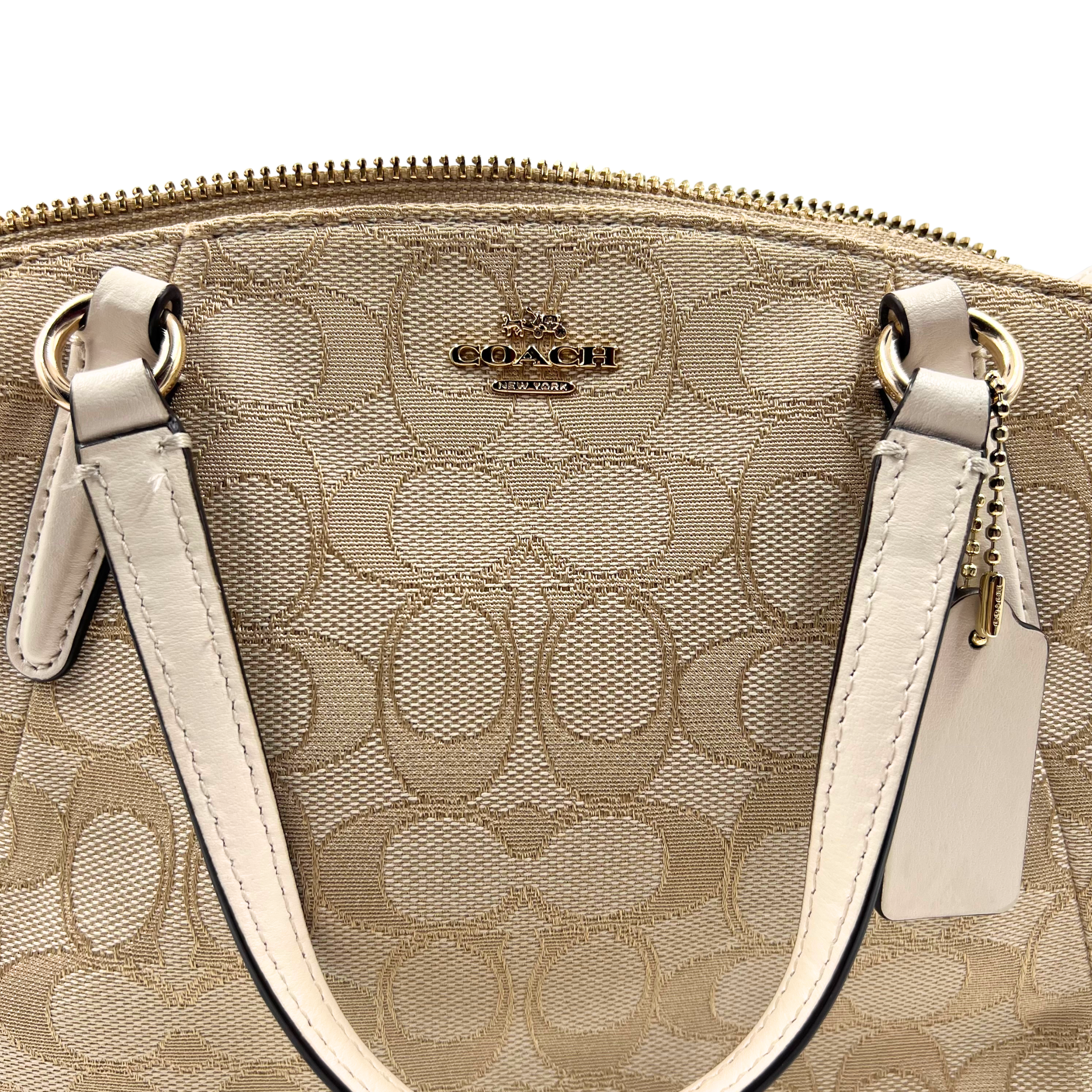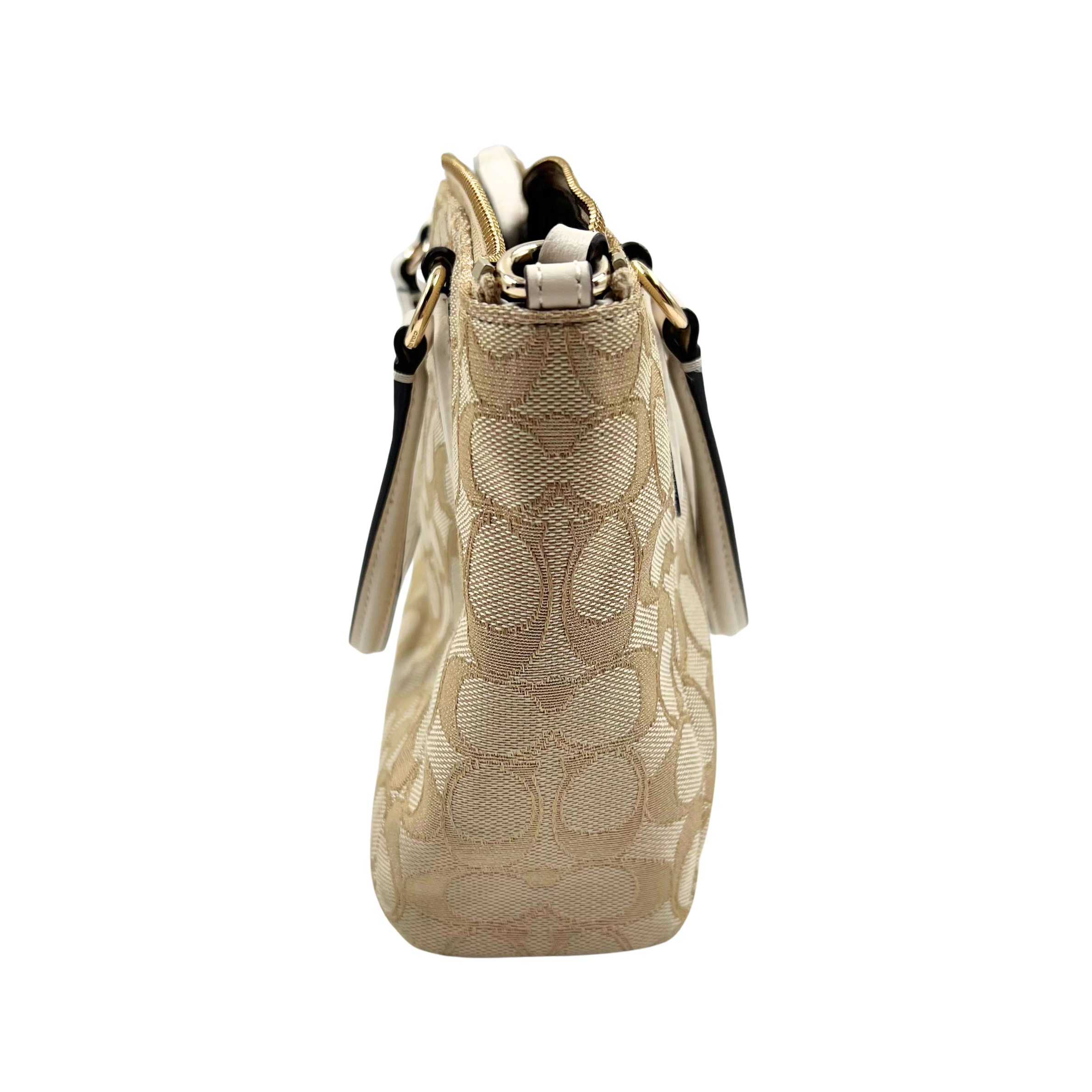 This Coach two-way bag combines signature monogram canvas with refined white leather accents and polished gold hardware. The top zip closure ensures secure storage, while the brown fabric lining adds durability and style.