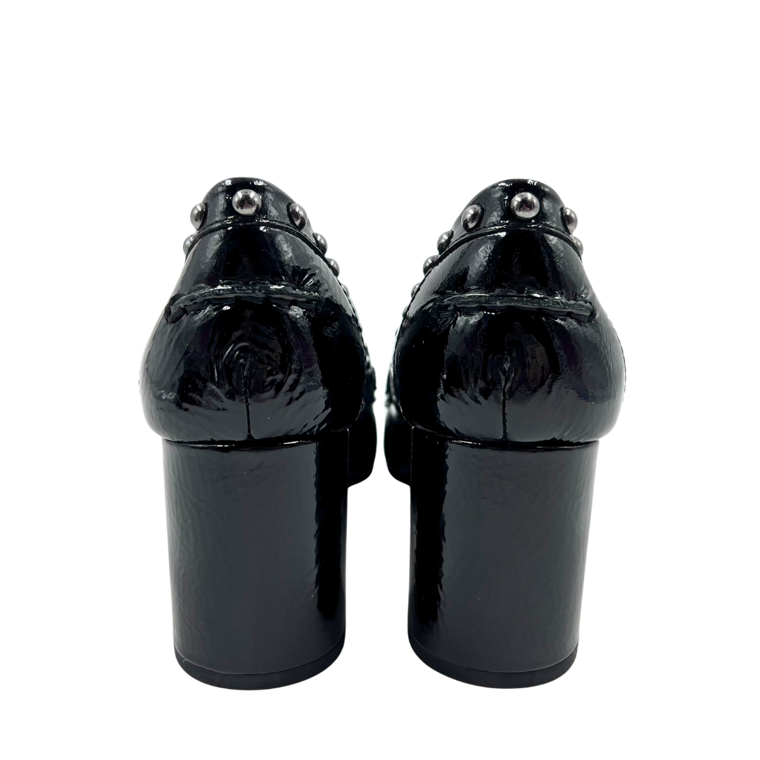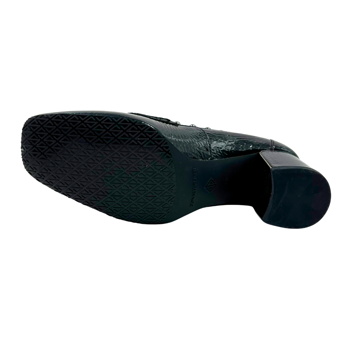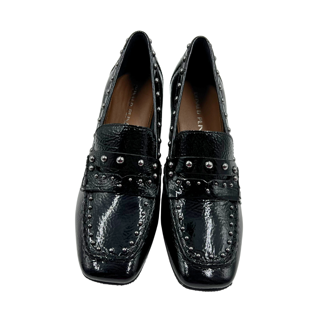 Sophisticated black patent leather loafers by Donald Pliner, featuring a sturdy block heel and eye-catching gunmetal stud embellishments. The polished penny loafer silhouette delivers refined elegance for both professional and casual settings.