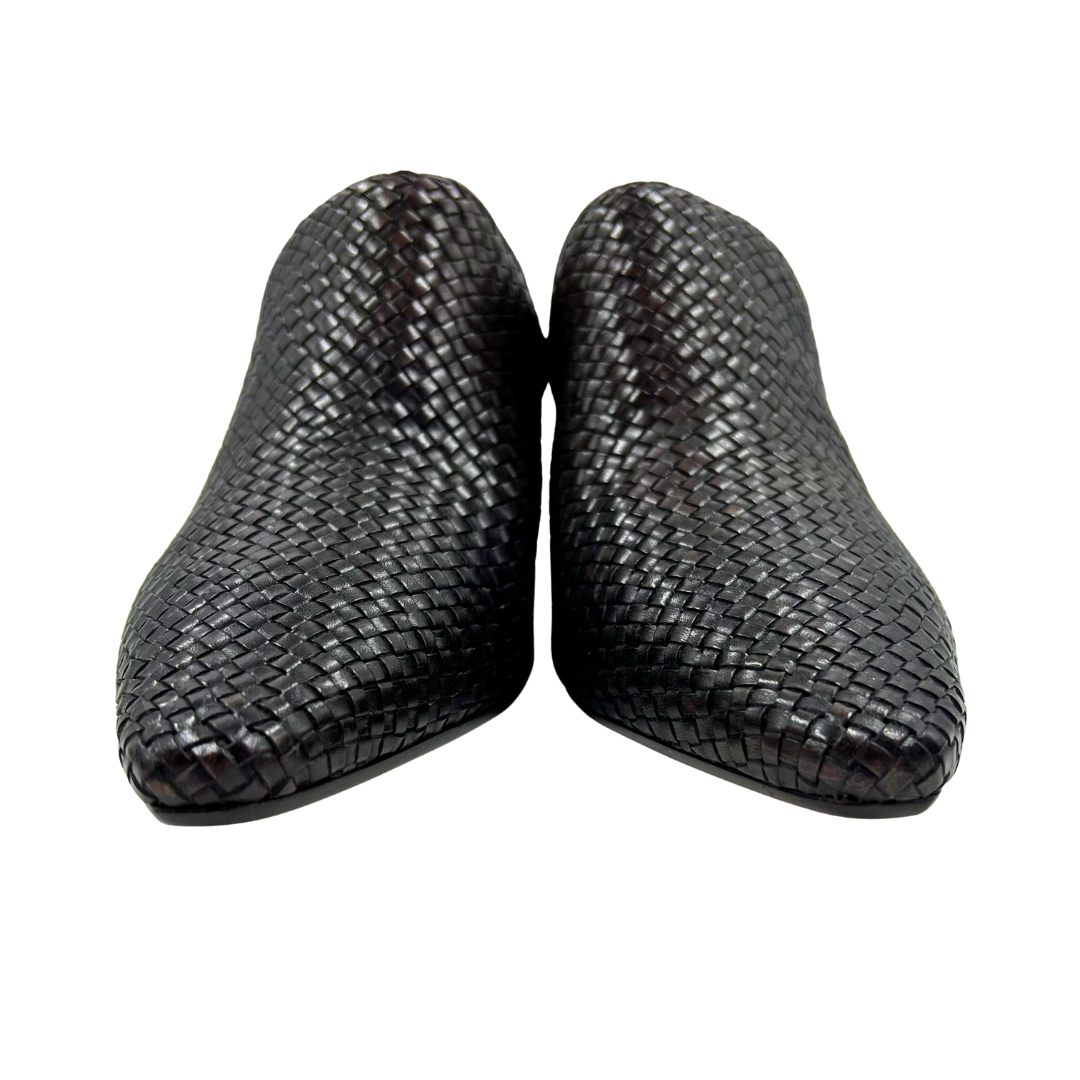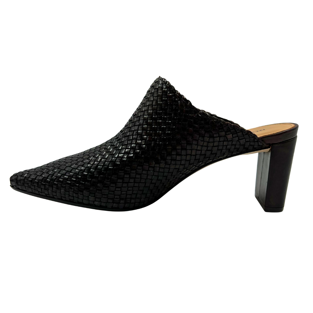 Elegant brown woven leather mules by Donald Pliner, showcasing an almond toe and comfortable heel. The slip-on design offers effortless style without sacrificing sophistication.