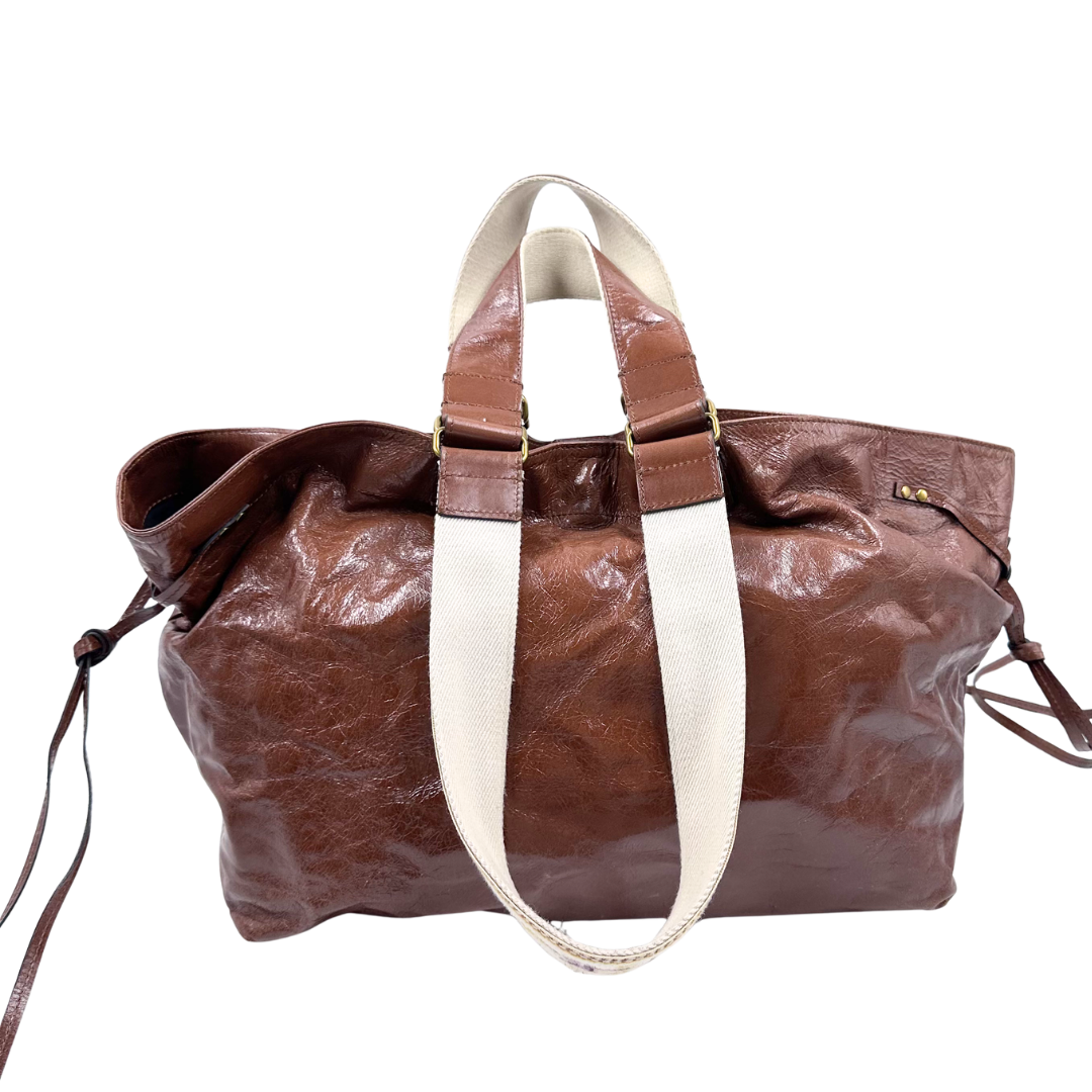 Carry with confidence in this Isabel Marant Wardy leather shopper tote, featuring rich brown aged leather that develops character over time. The durable canvas shoulder strap and vintage-inspired aged gold hardware provide both comfort and style, while the magnetic button closure secures your daily essentials with ease.