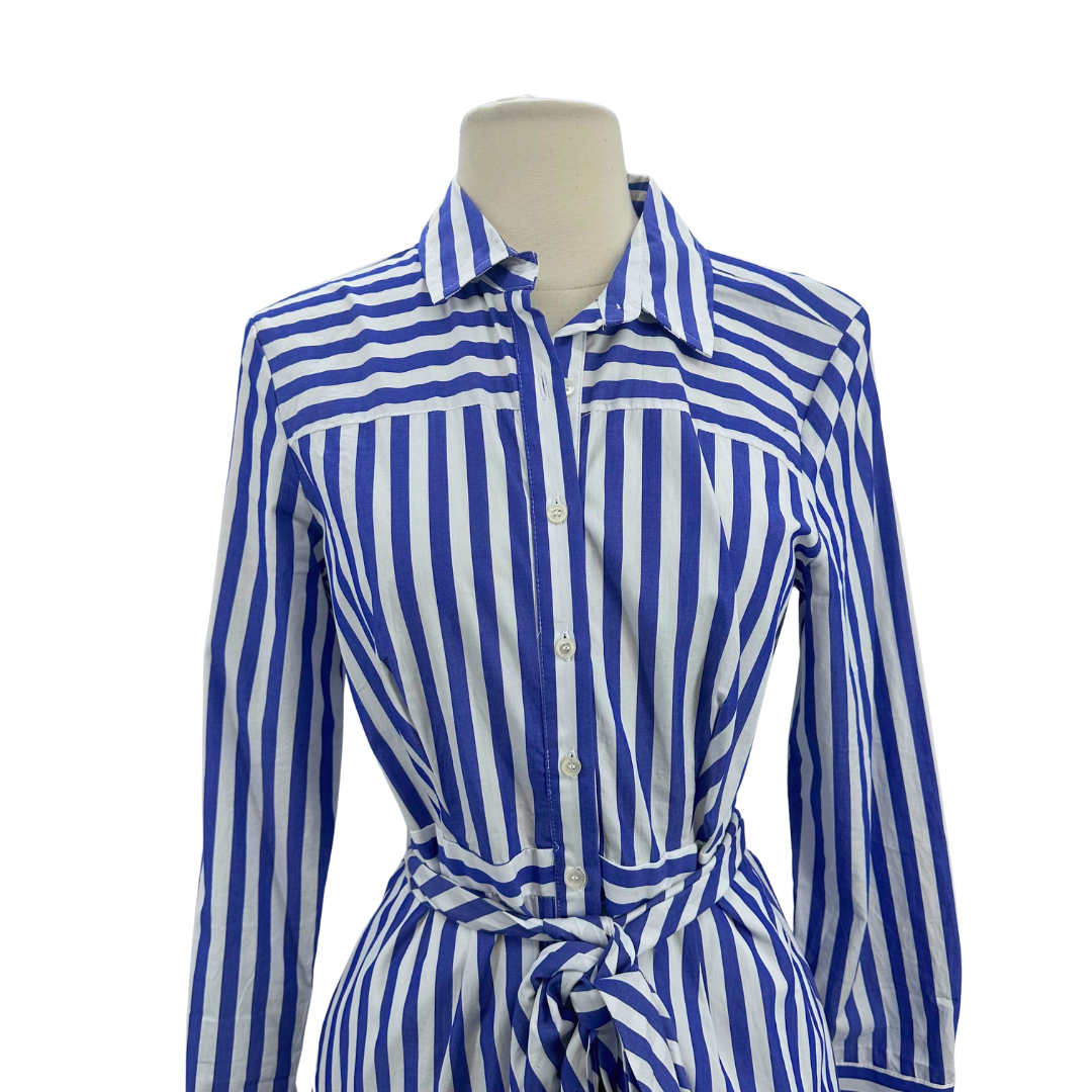 This J Crew blue and white striped shirtdress features a flattering flare skirt that combines classic tailoring with feminine movement. The crisp striped pattern offers timeless appeal while the shirt-style bodice provides structure and versatility.