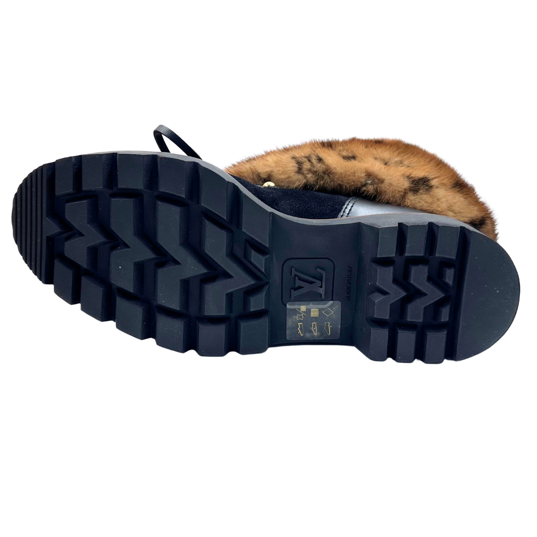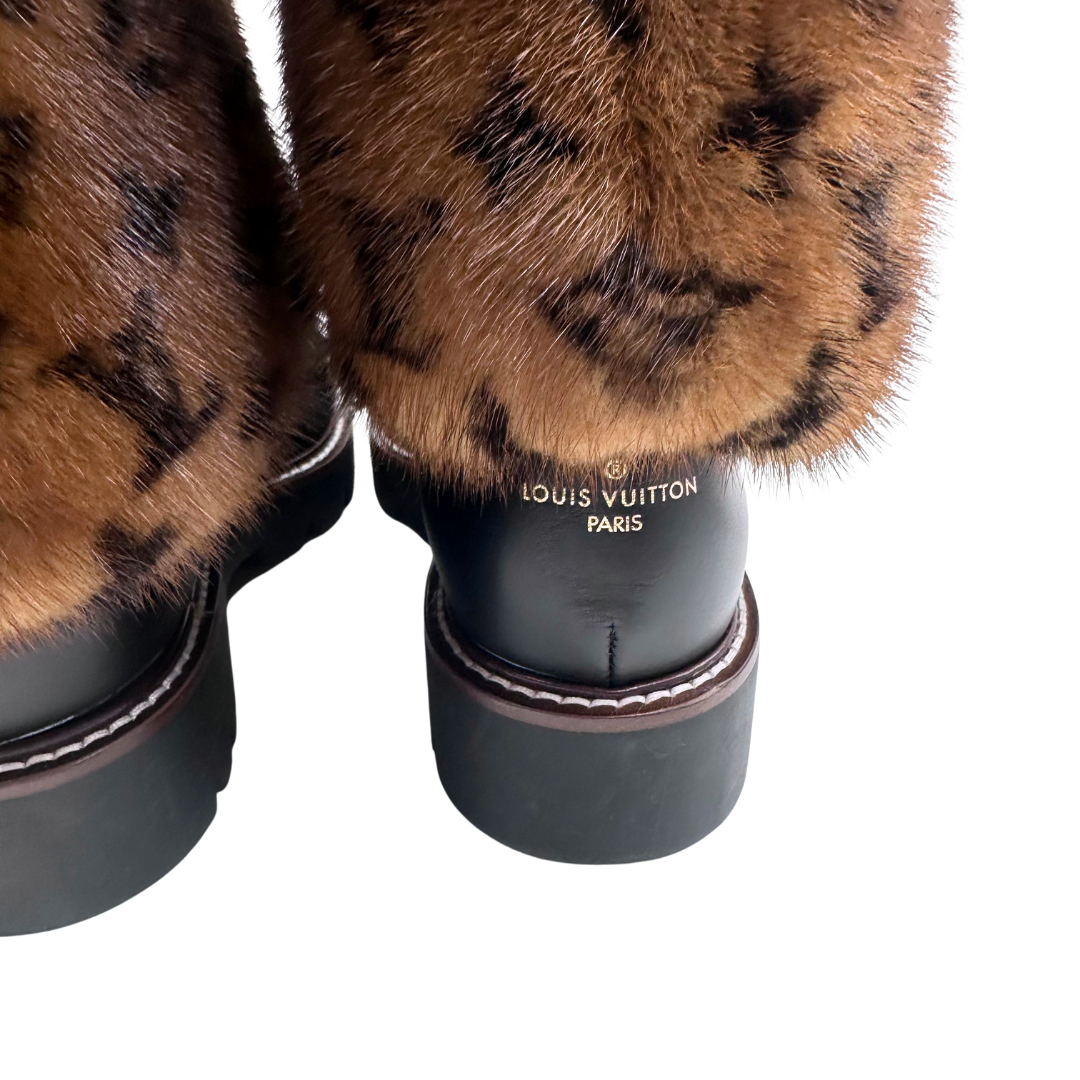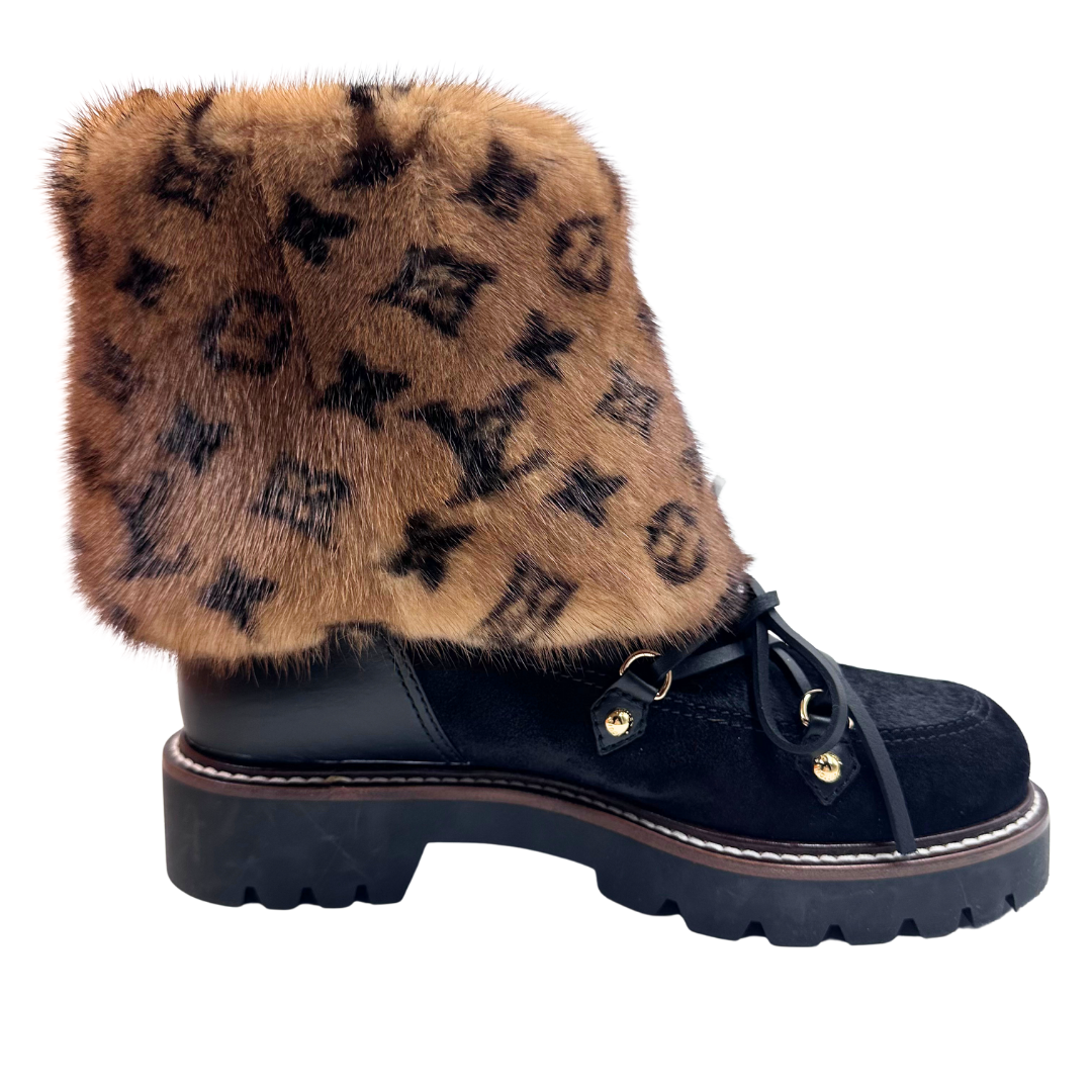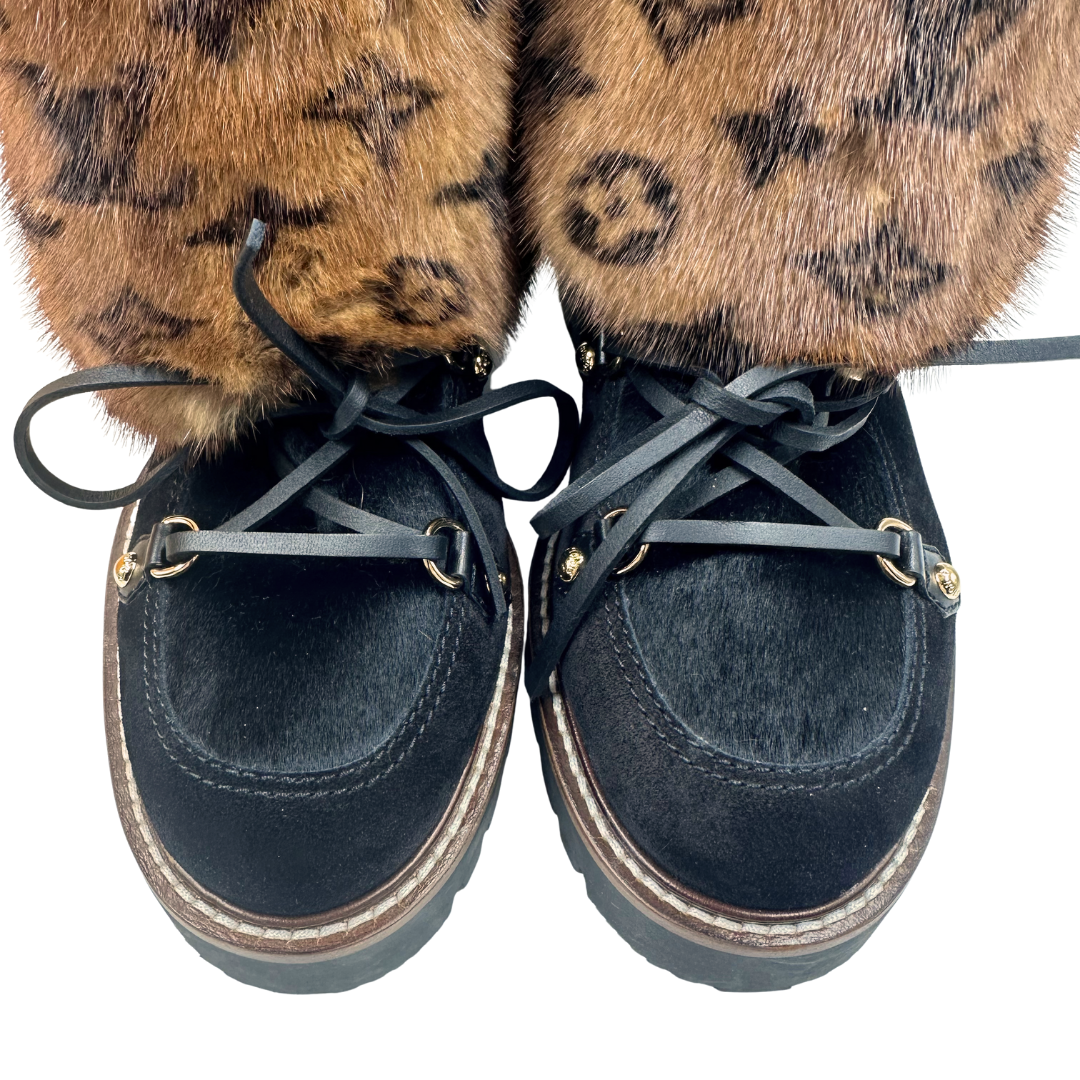 Elevate your winter wardrobe with these Louis Vuitton boots, crafted from luxurious black suede and leather complemented by rich brown mink fur detailing. The monogrammed mink adds sophisticated texture and warmth, while polished gold hardware provides a refined finishing touch.