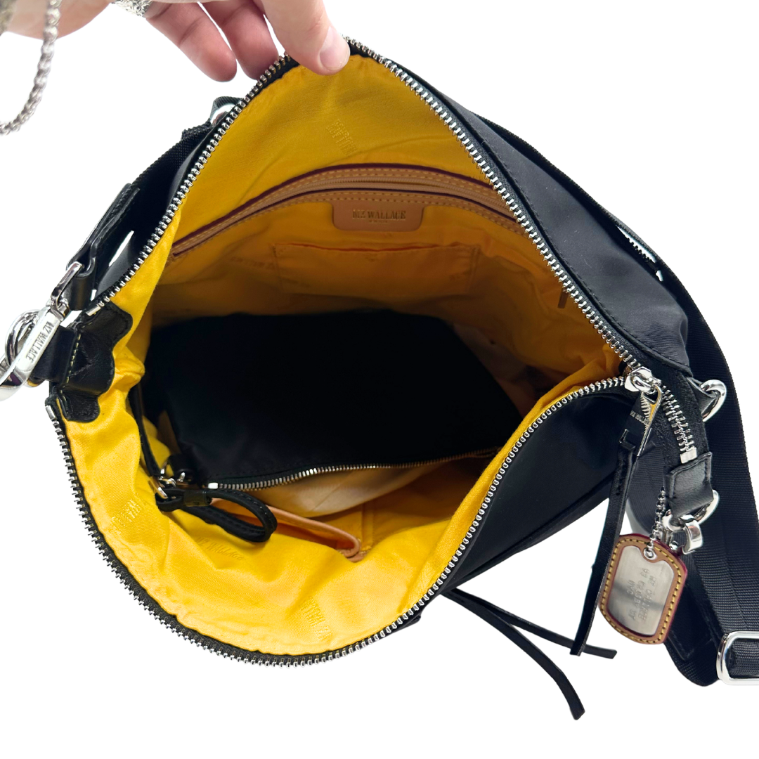 Sleek MZ Wallace hobo in durable black nylon with polished silver hardware. Features a convenient top zip entry, two front zip pockets, and an interior pouch for organized storage. Versatile two-way design transitions seamlessly from shoulder to crossbody carry.