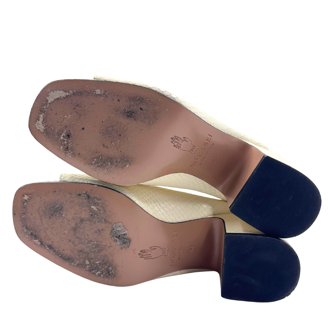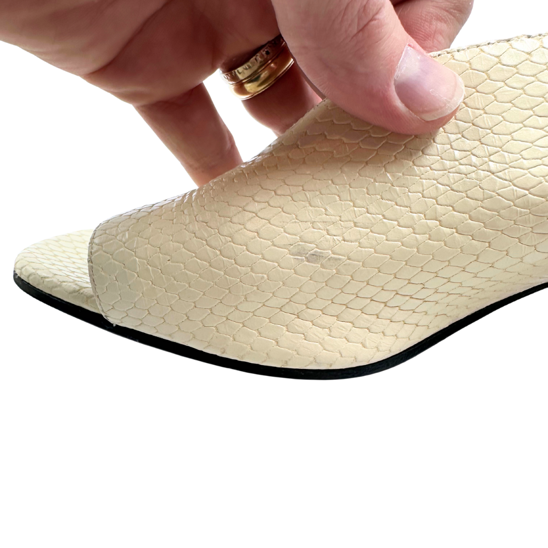 Elegant white leather heels featuring a distinctive peep toe silhouette and embossed design with a decorative slit accented by a silver buckle. The sturdy block heel provides comfortable all-day wear while maintaining a polished, sophisticated look.