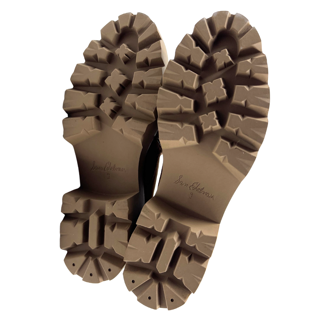Elevate your everyday style with this Sam Edelman brown suede moccasin in size 9. Featuring a sophisticated lace-up detail and gleaming gold hardware, this shoe combines classic comfort with modern edge. The sturdy platform lug sole provides excellent traction and durability.