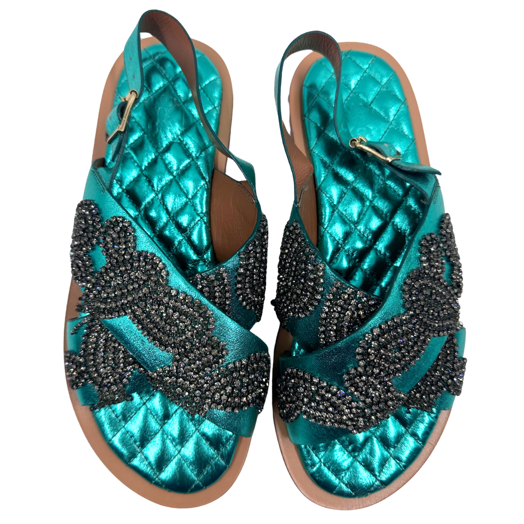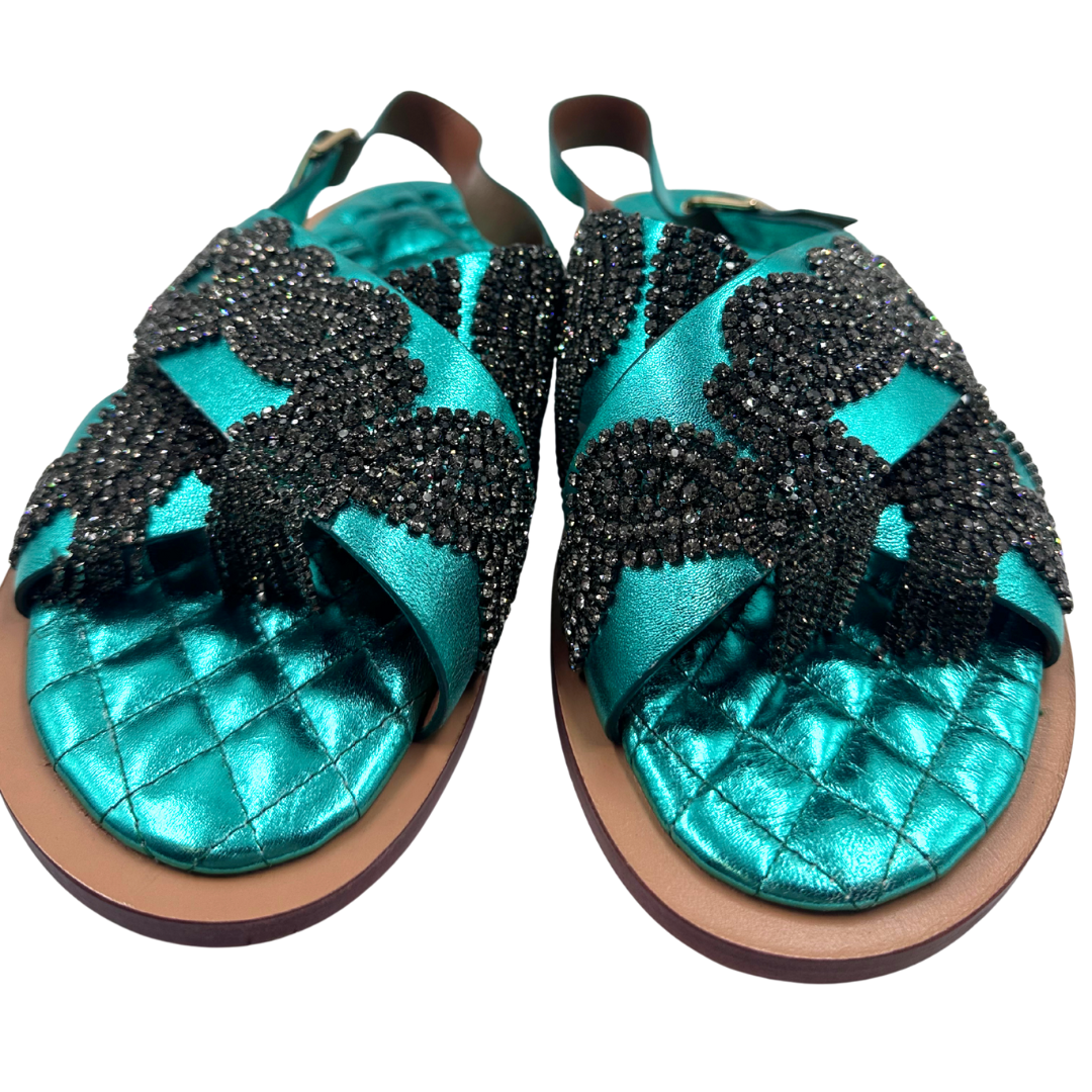 Elevate your footwear collection with these striking green metallic leather sandals. Featuring intricate beaded detailing and luxurious gold hardware, each pair showcases a quilted sole for comfort and visual interest. The secure ankle strap ensures a refined fit, making these versatile sandals perfect for both casual outings and elevated occasions.