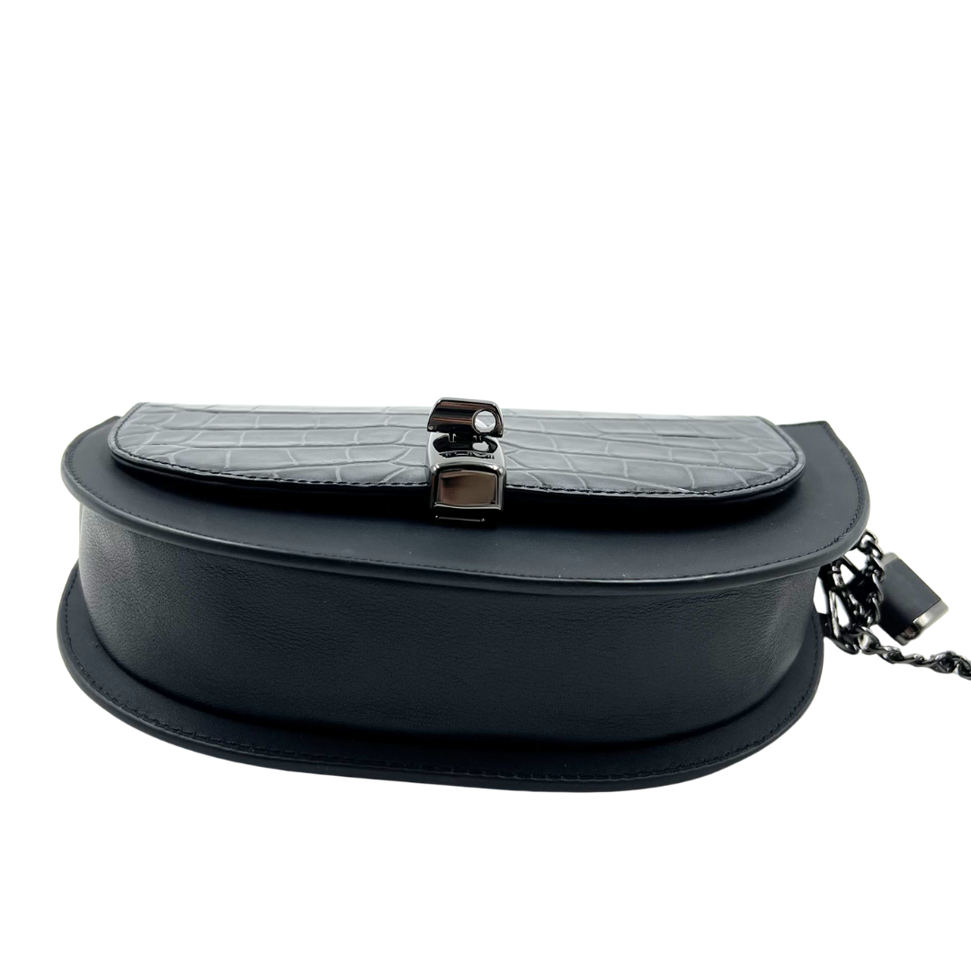 Sophisticated black leather crossbody by Tumi, featuring an embossed leather flap and gunmetal hardware with a secure turn lock clasp.