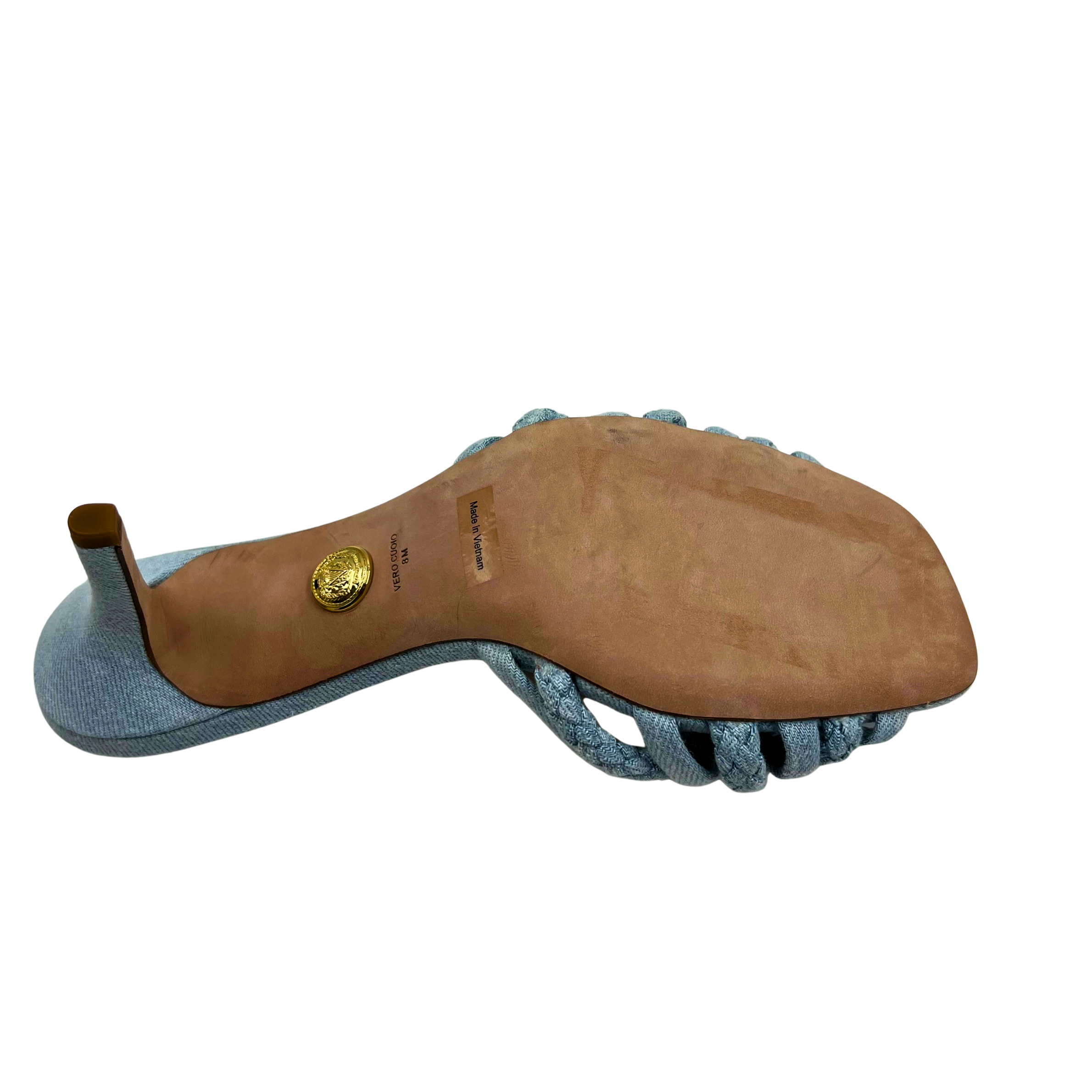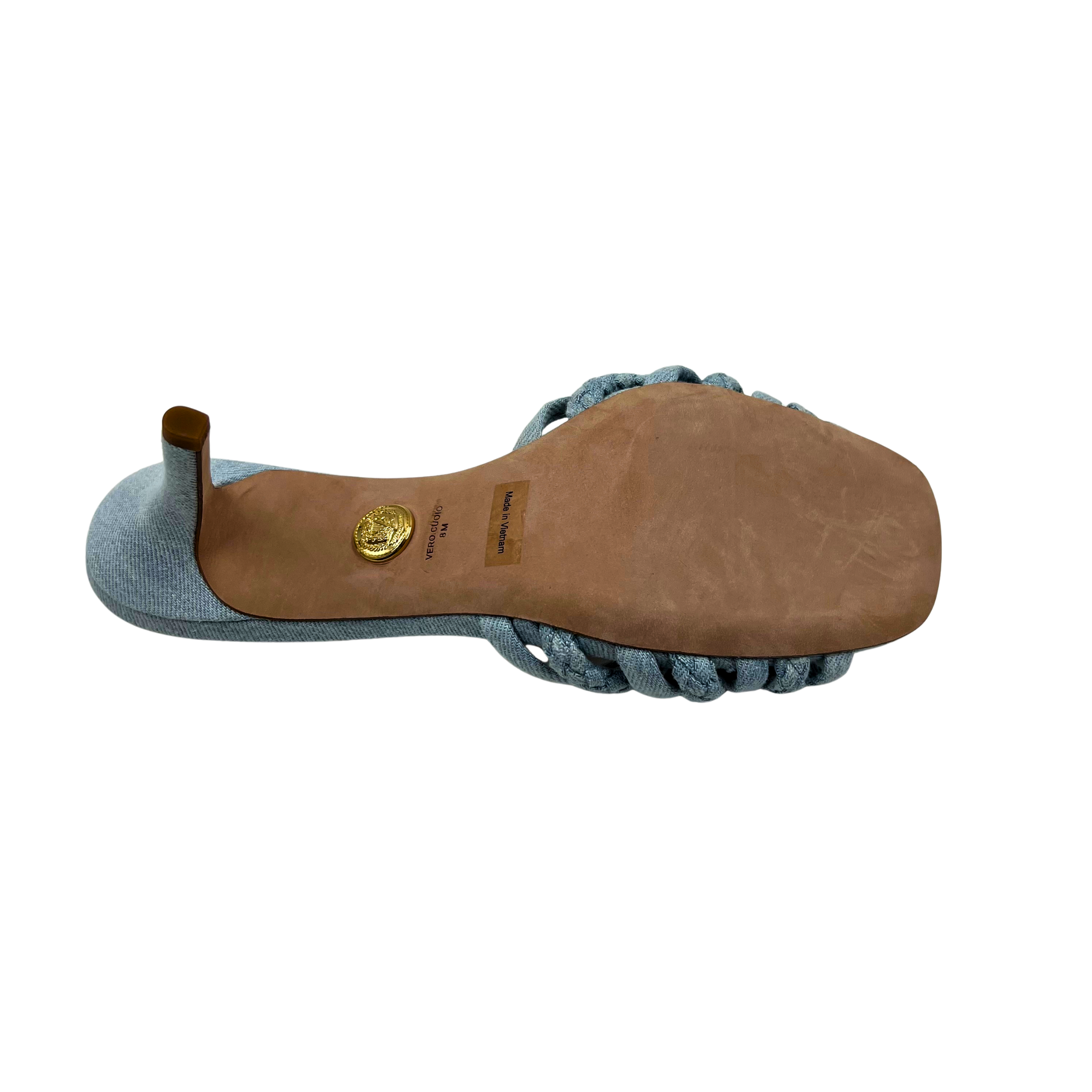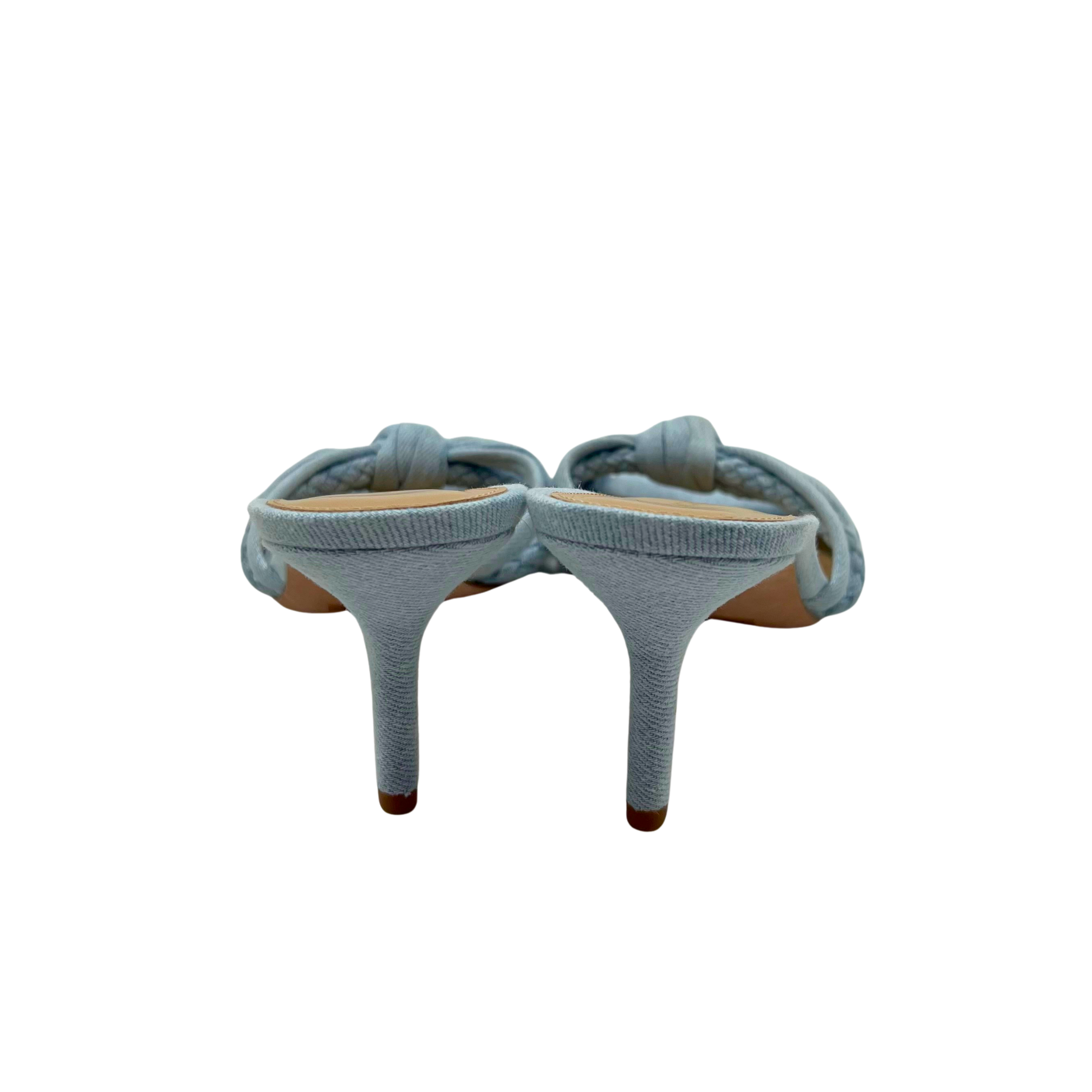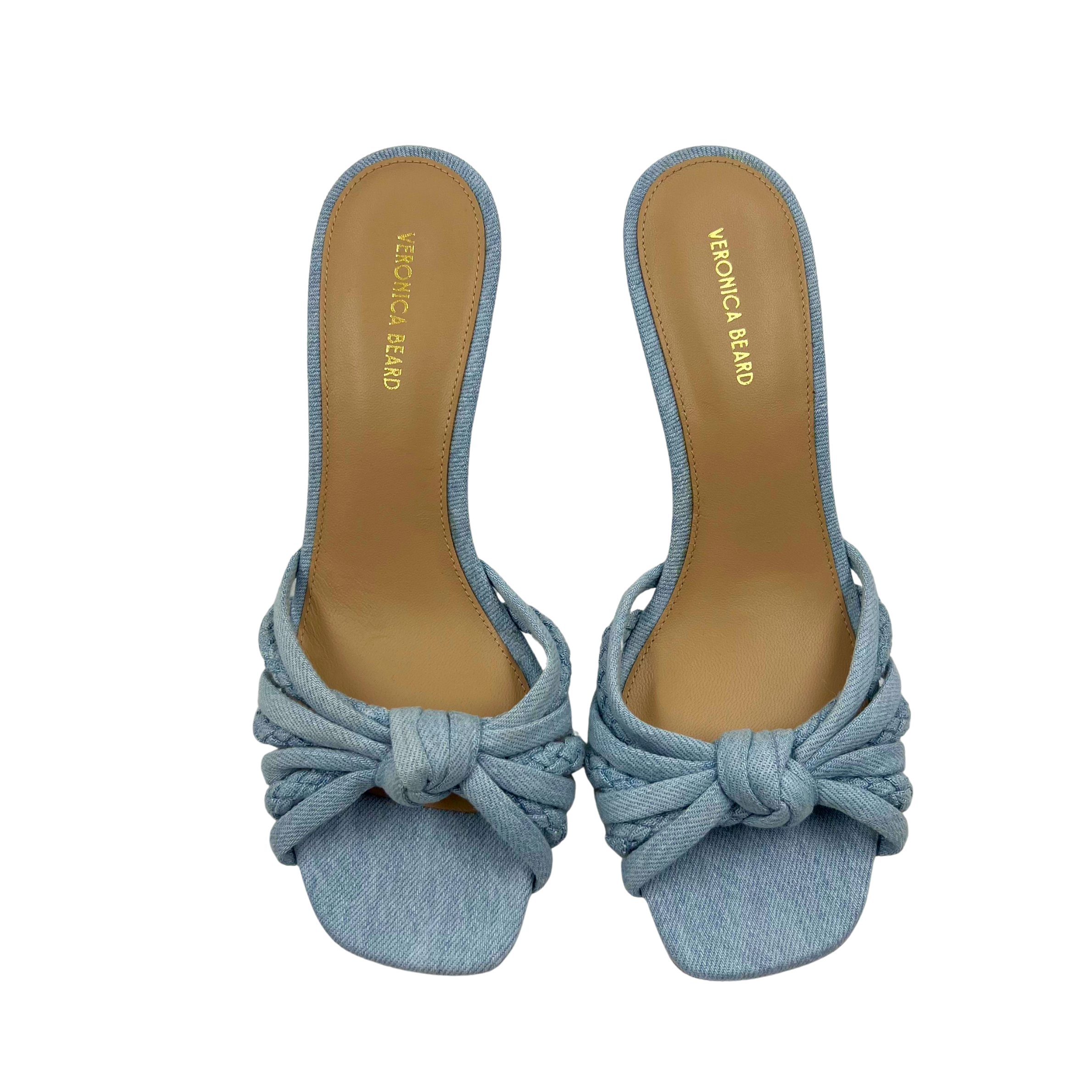Discover casual elegance with these Veronica Beard denim heels in soft light blue. The comfortable kitten heel and open-toe silhouette are enhanced by intricate braided and knot detailing.