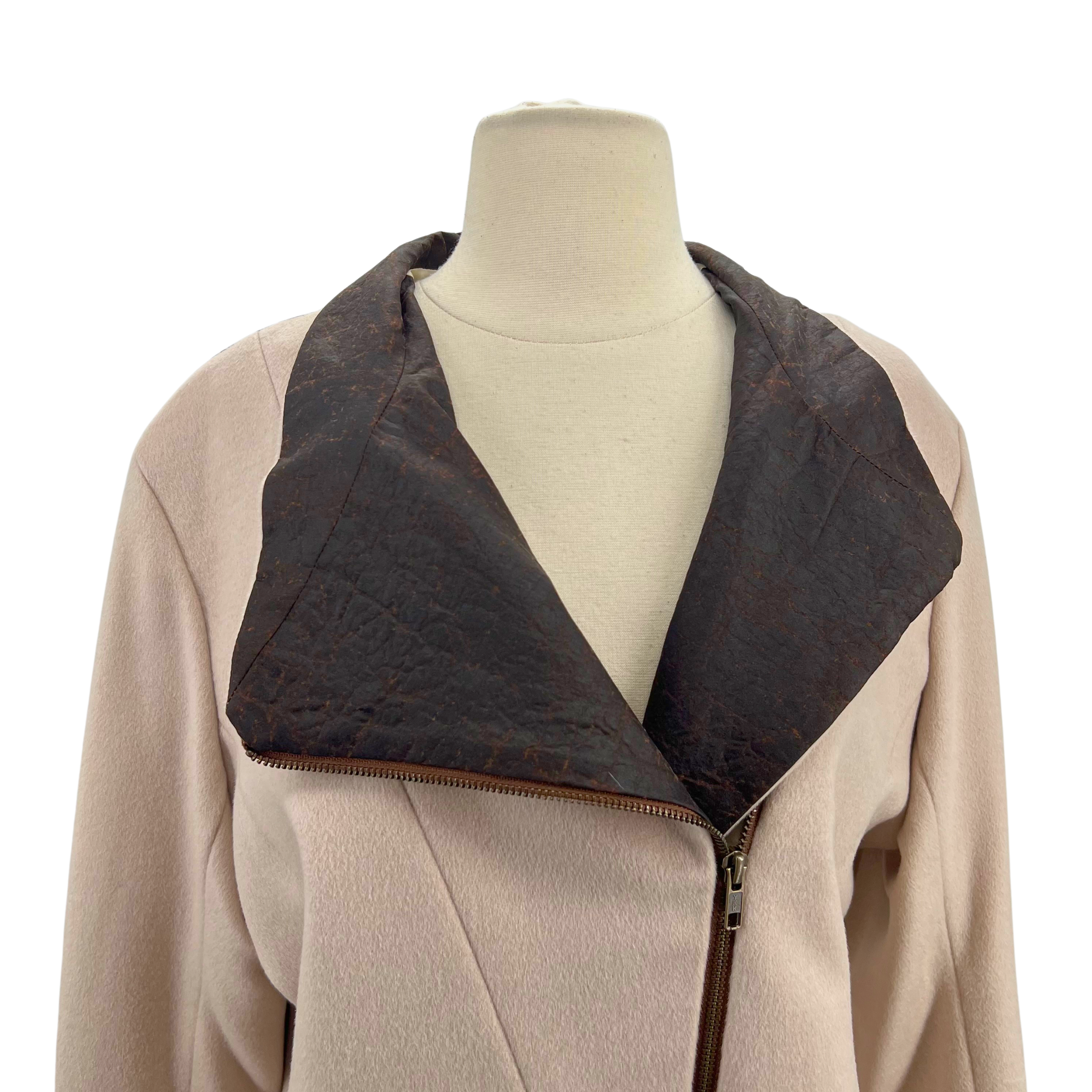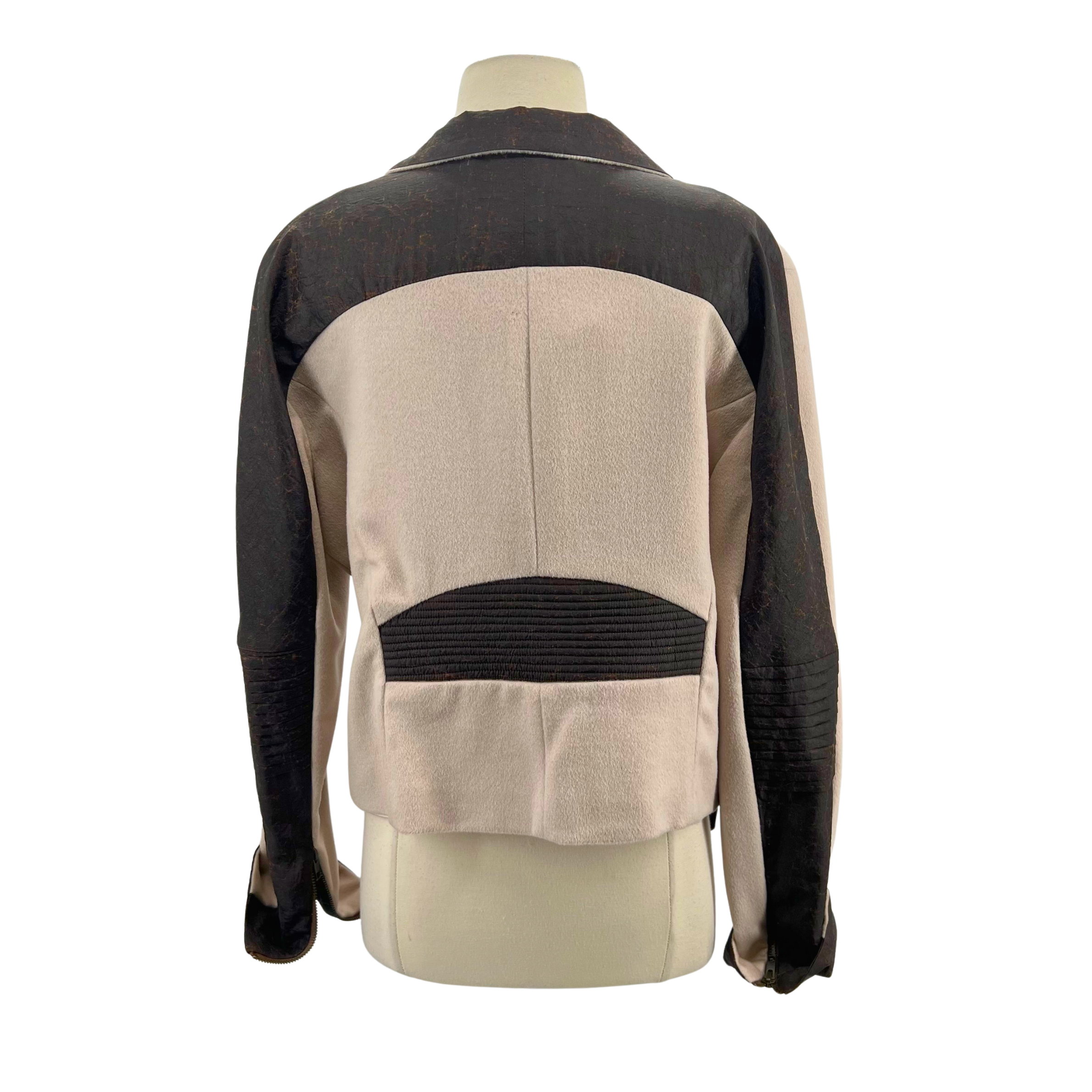 This Teresa Crowninshield beige jacket showcases distinctive dark brown fabric insets along the sleeves and collar, creating visual interest through thoughtful contrast. The neutral beige base offers versatile styling options, while the rich brown accents add depth and character.