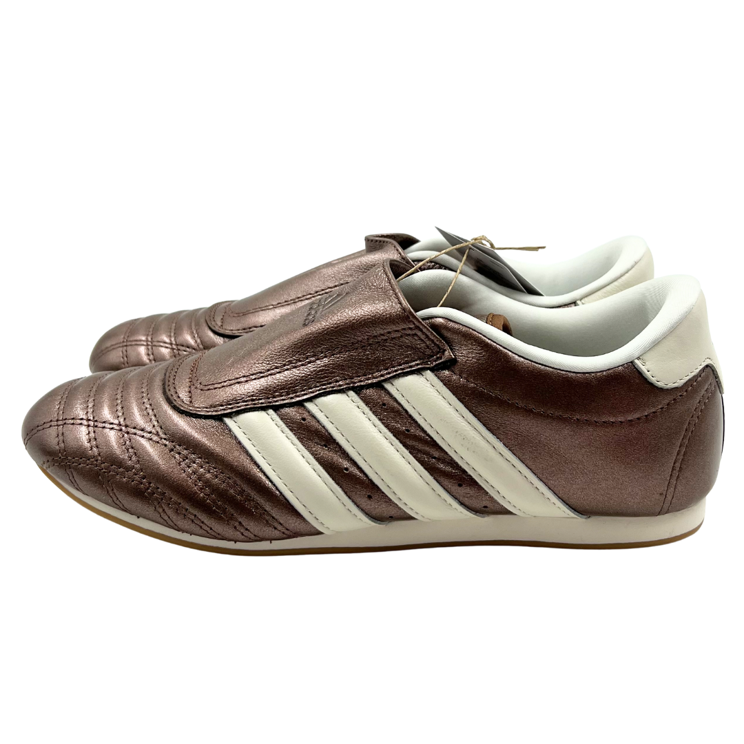 Step into effortless style with these Adidas slip-on sneakers featuring a striking rosegold/bronze leather upper accented with white striping. The sleek, minimalist design transitions seamlessly from casual outings to everyday wear.