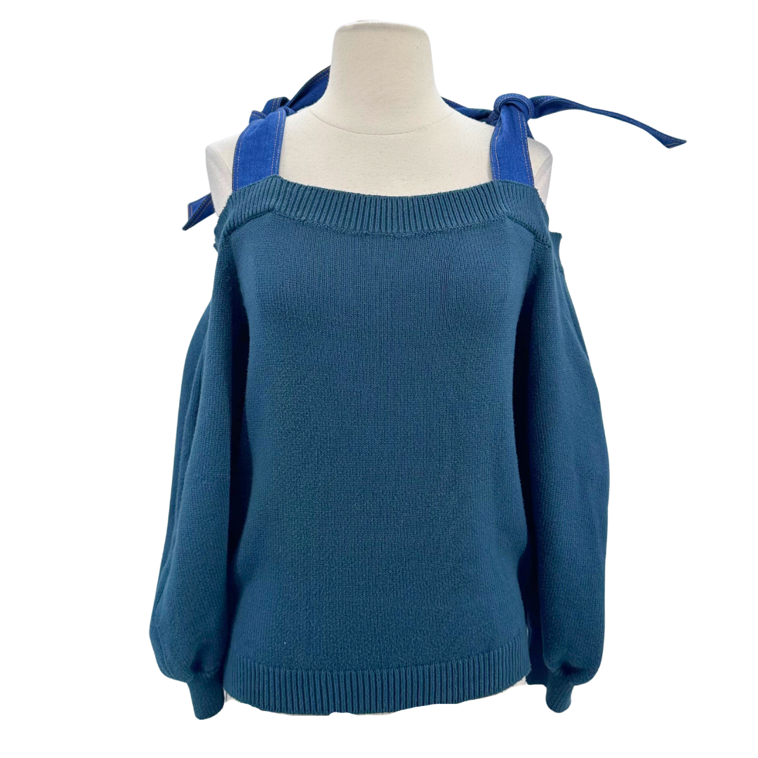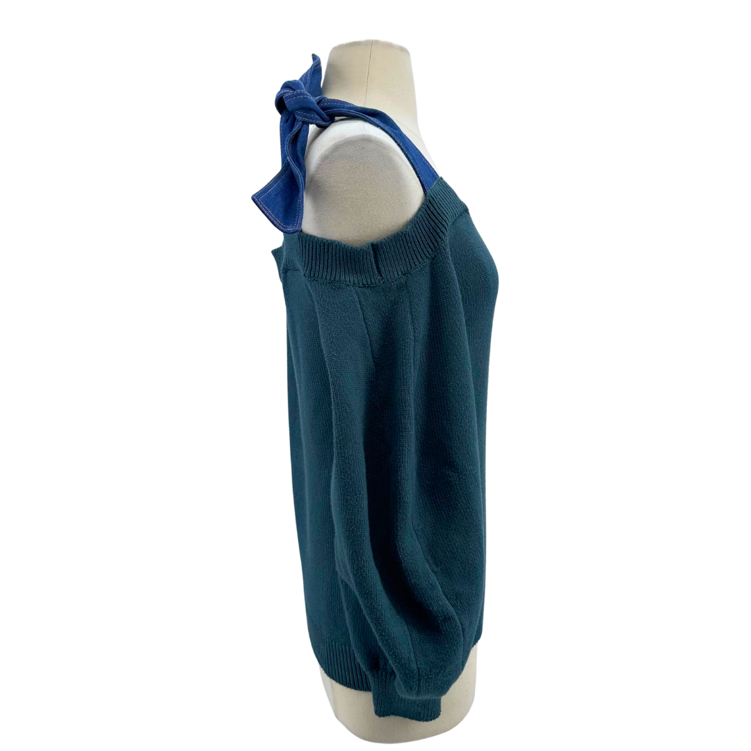 Adeam Juniper Sweater This juniper-hued sweater features distinctive denim straps that blend casual and refined aesthetics. The unexpected detail elevates a classic silhouette, creating visual interest while maintaining wearability.