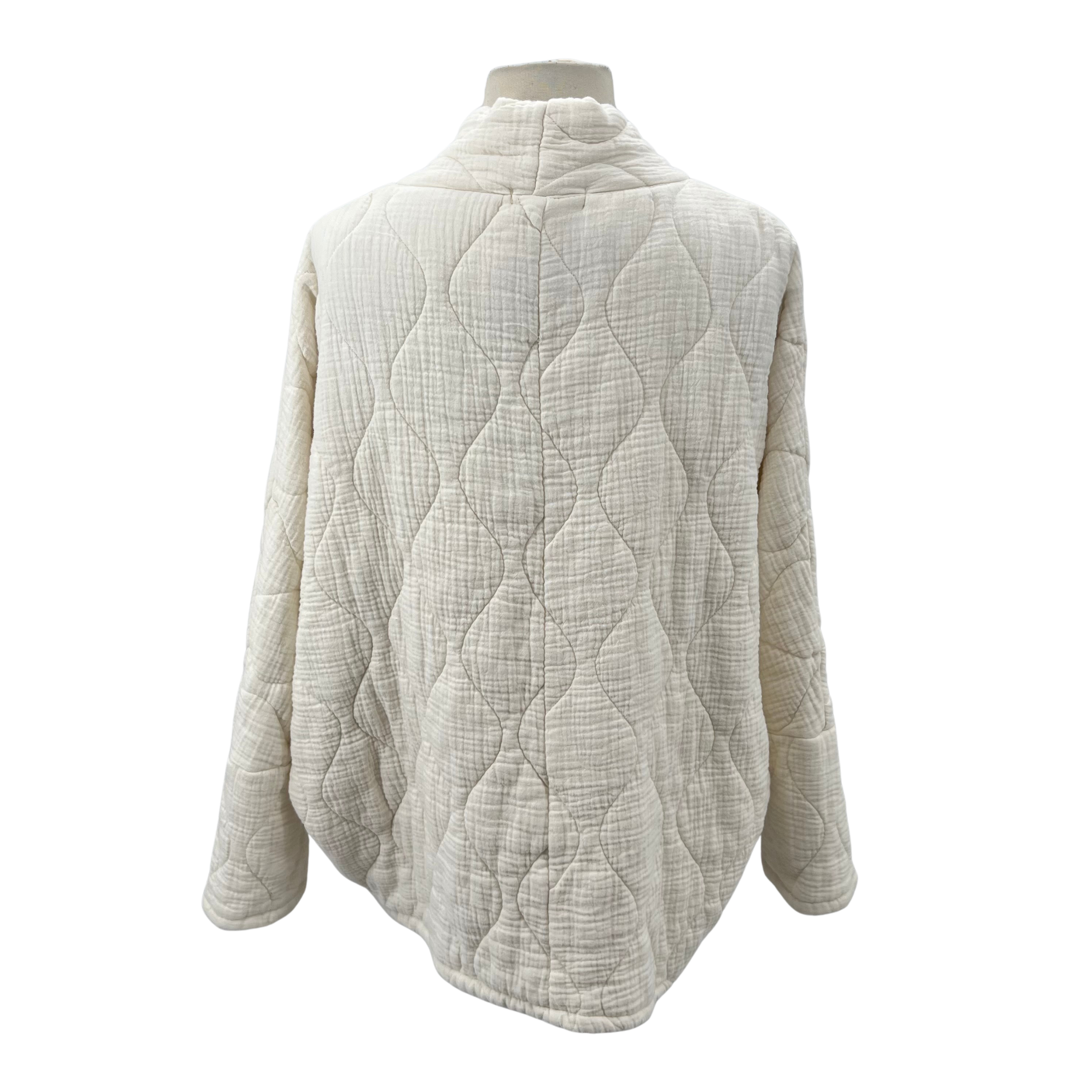 AOKYANOS Ivory Quilted Jacket in size L. Crafted from soft cotton with a quilted design for added warmth and texture. This classic ivory piece layers beautifully over any outfit, offering timeless style and comfort.