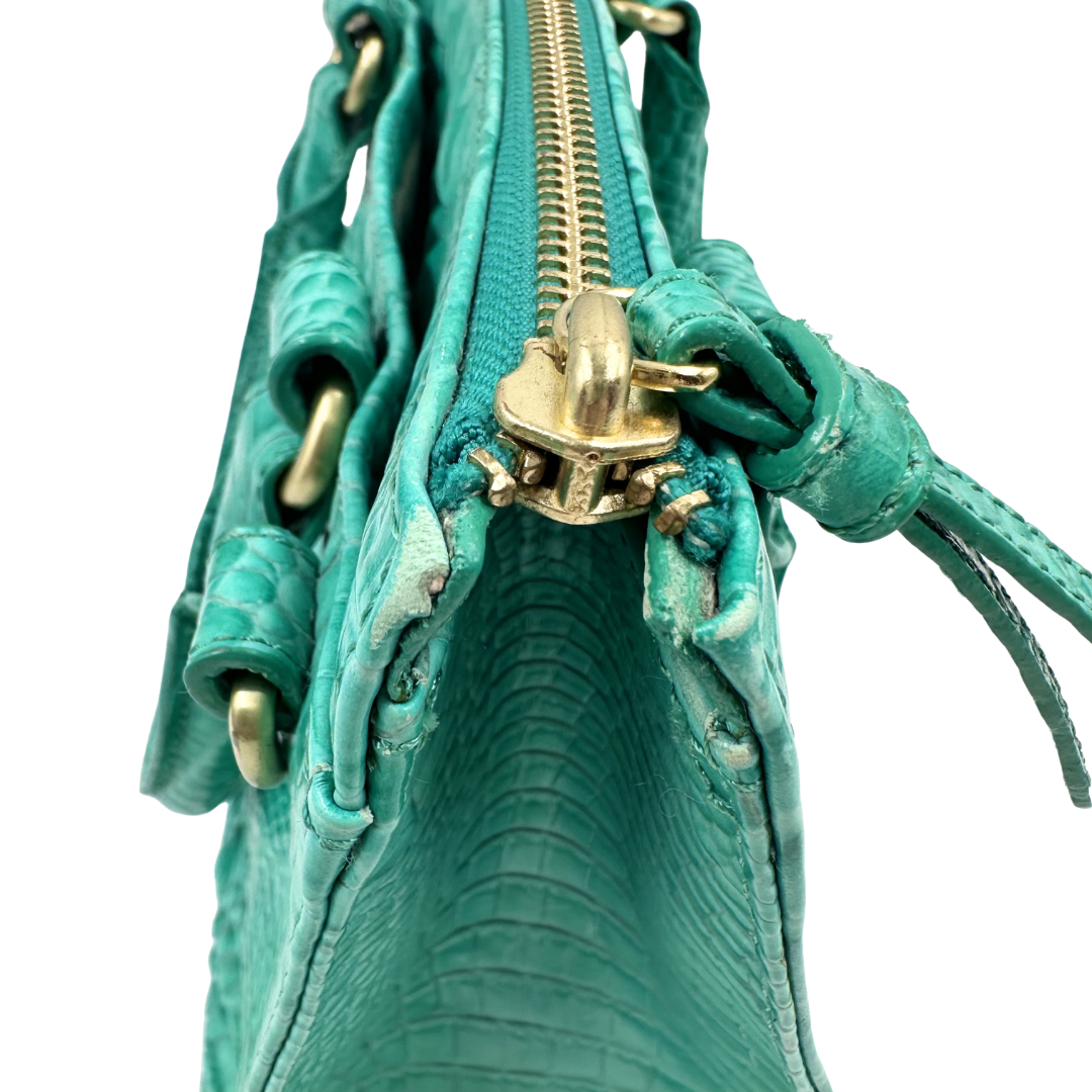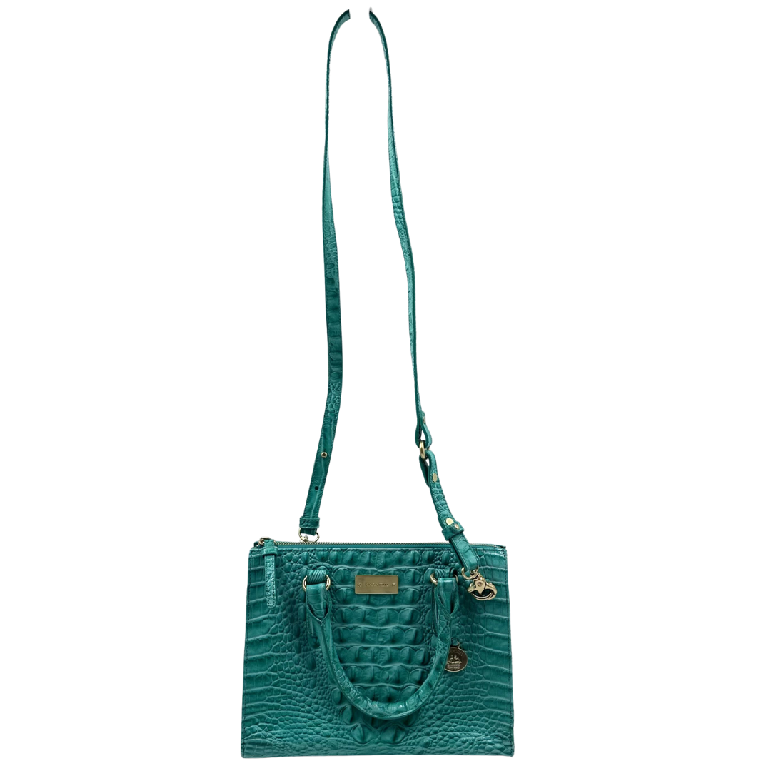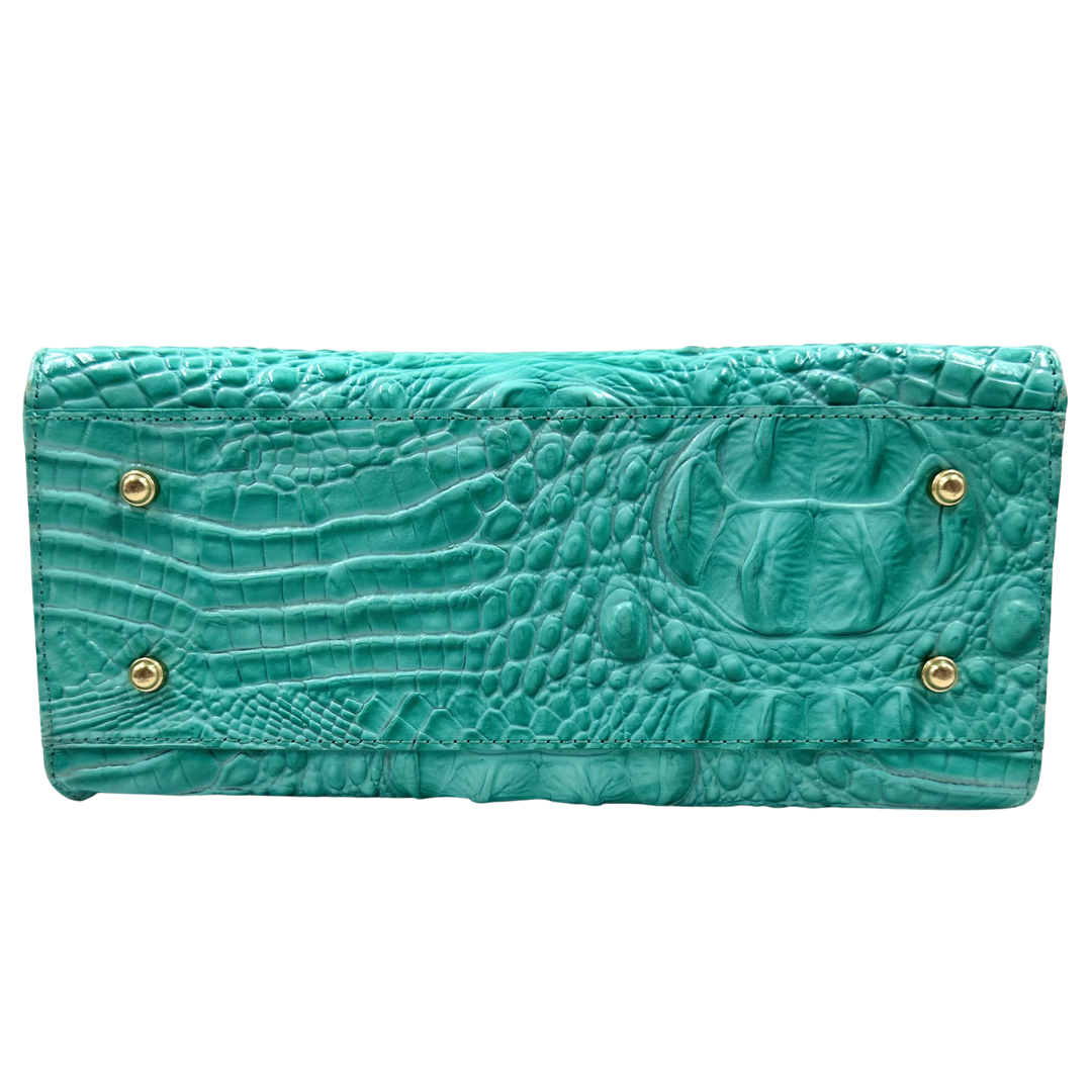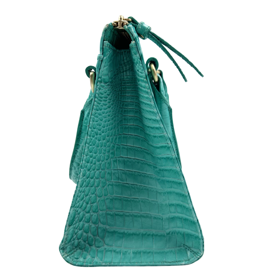 Sophisticated Brahmin two-way bag in luxurious green croc-embossed leather with polished gold hardware. The top zip closure ensures secure storage, while protective feet on the base safeguard the leather from wear.