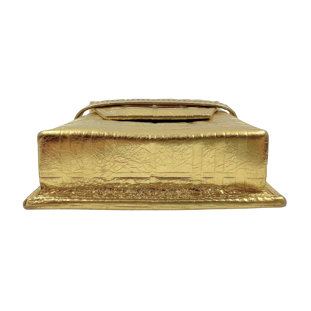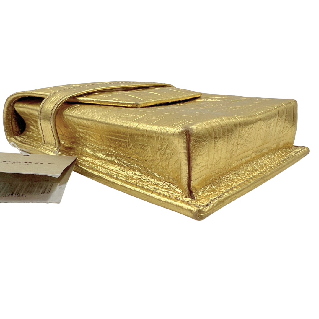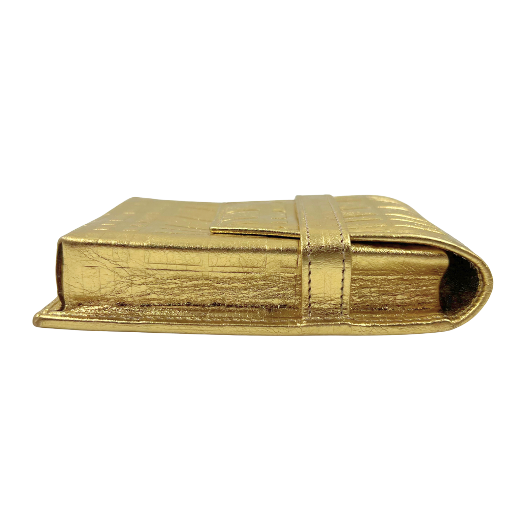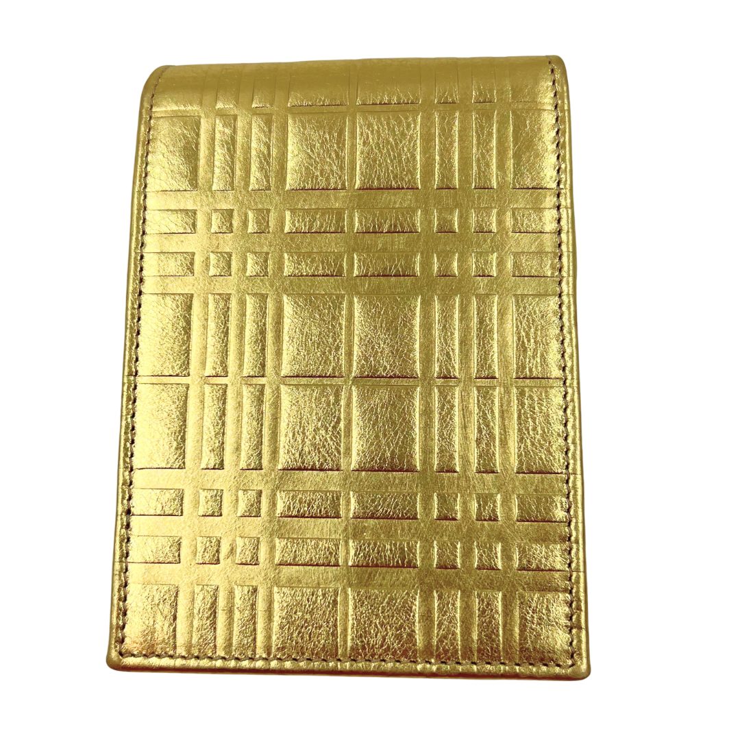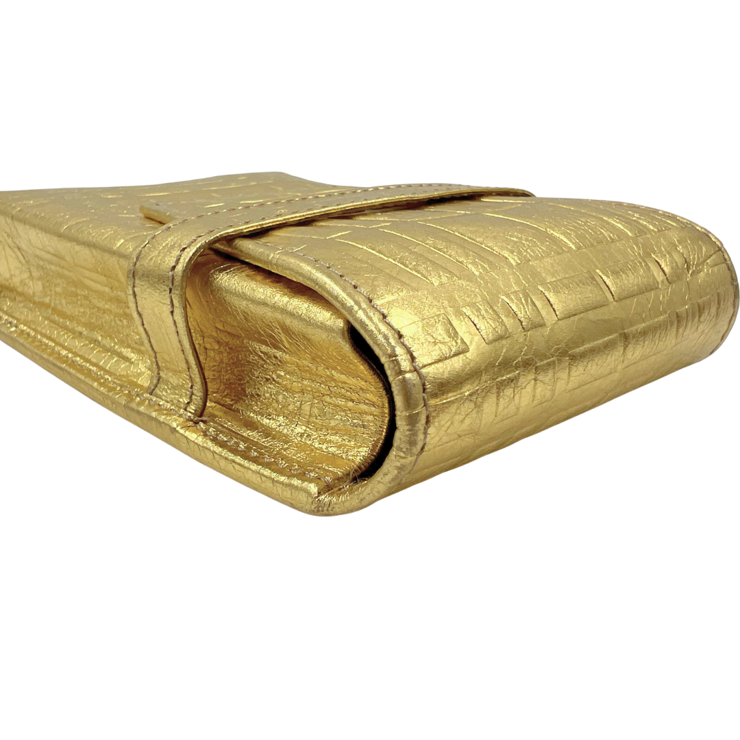 Luxurious cosmetic pouch in supple gold leather with an elegant fold-over closure design. Perfect for organizing beauty essentials while maintaining a refined, compact silhouette.