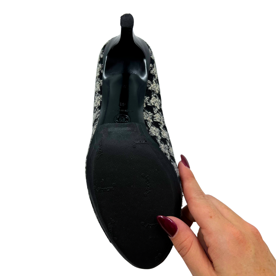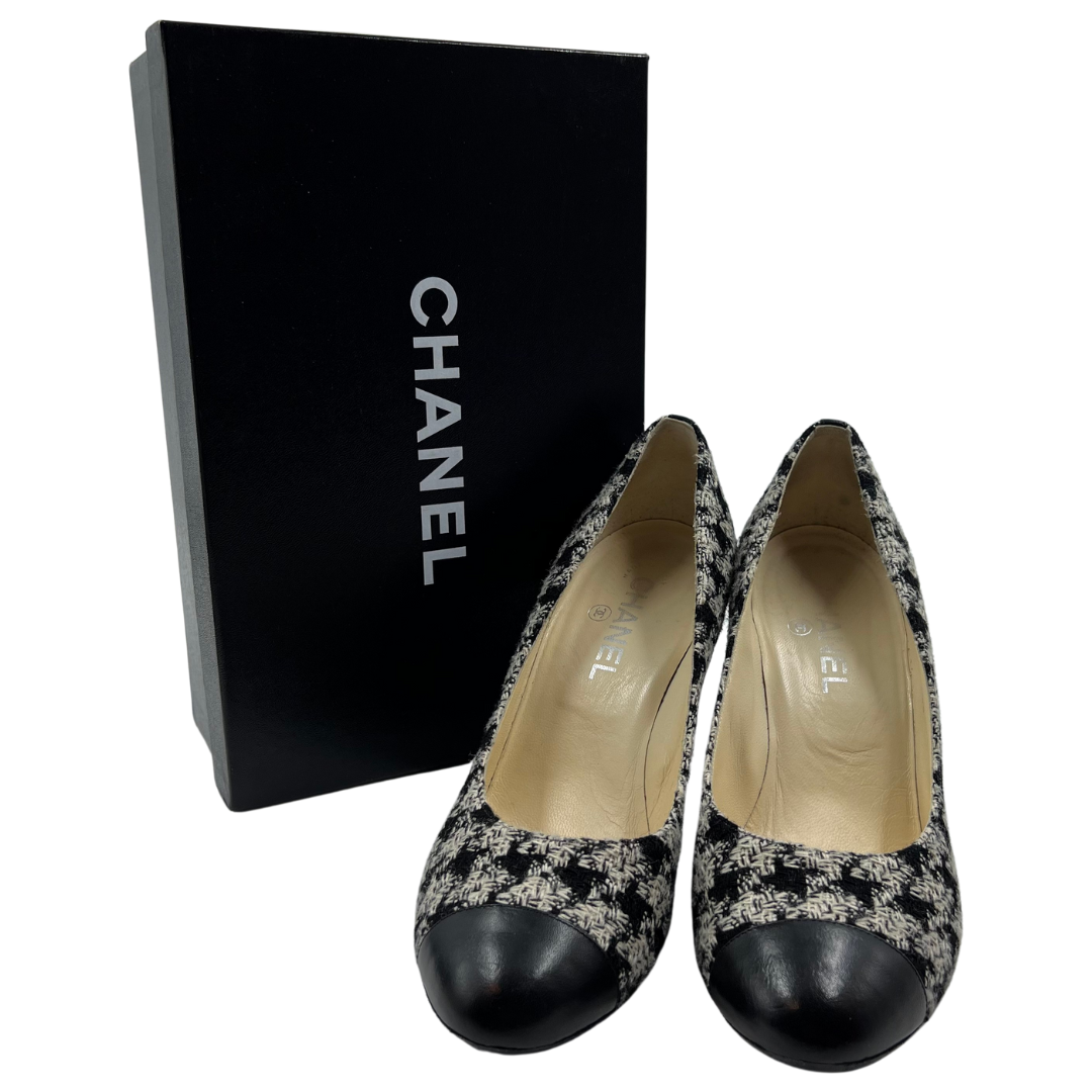 These Chanel heels feature a classic houndstooth tweed fabric complemented by sleek leather toe detailing.