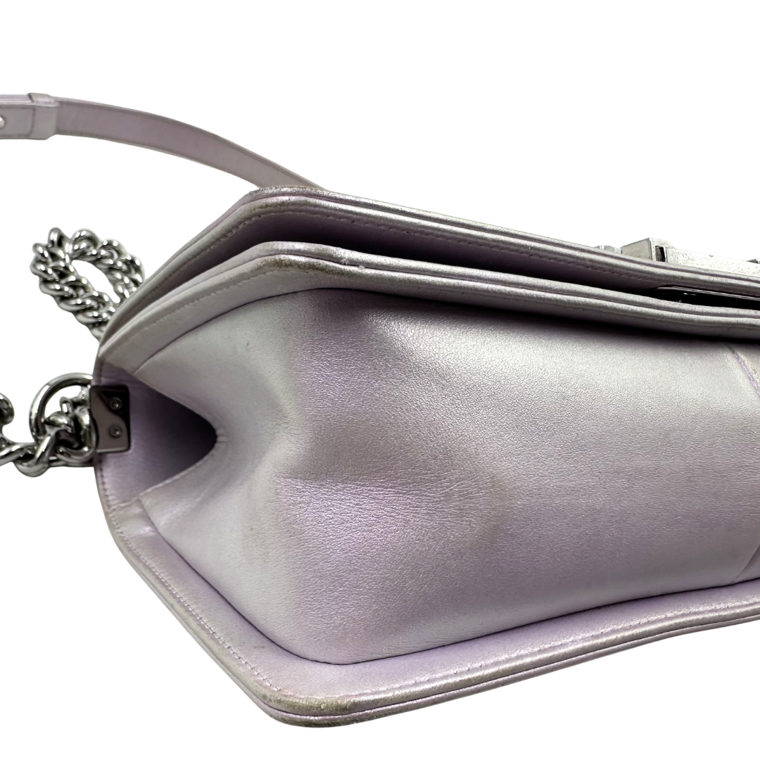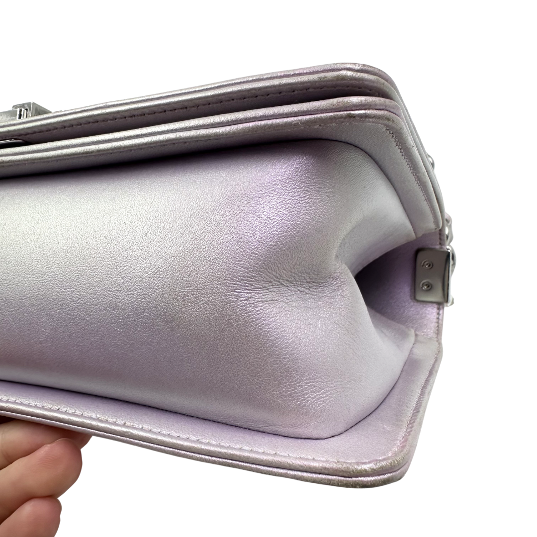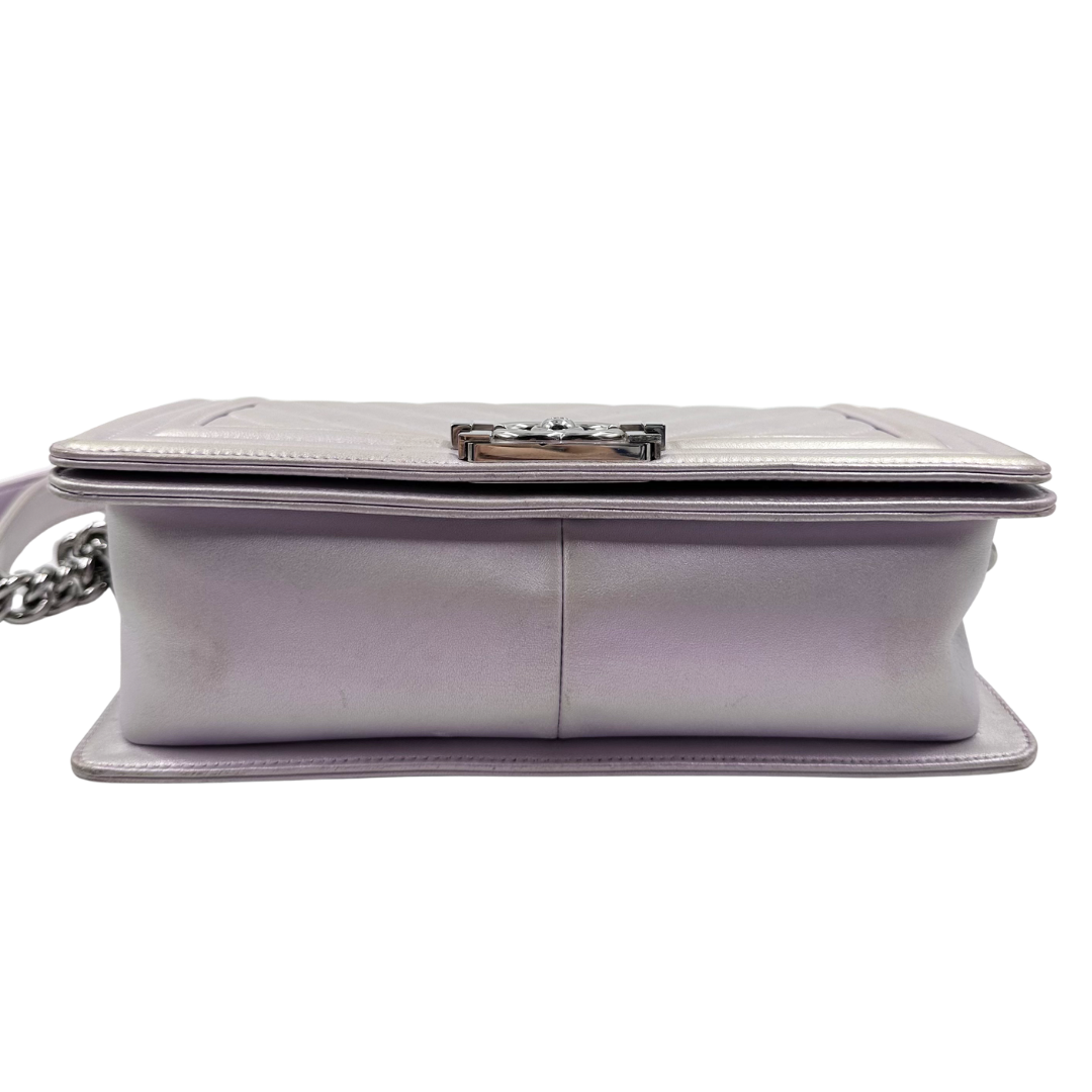 Iridescent lilac lambskin with silver hardware and iconic CC push lock closure. This Chanel Chevron Boy Bag combines luxe craftsmanship with timeless design—perfect for adding an elegant pop of color to any outfit.