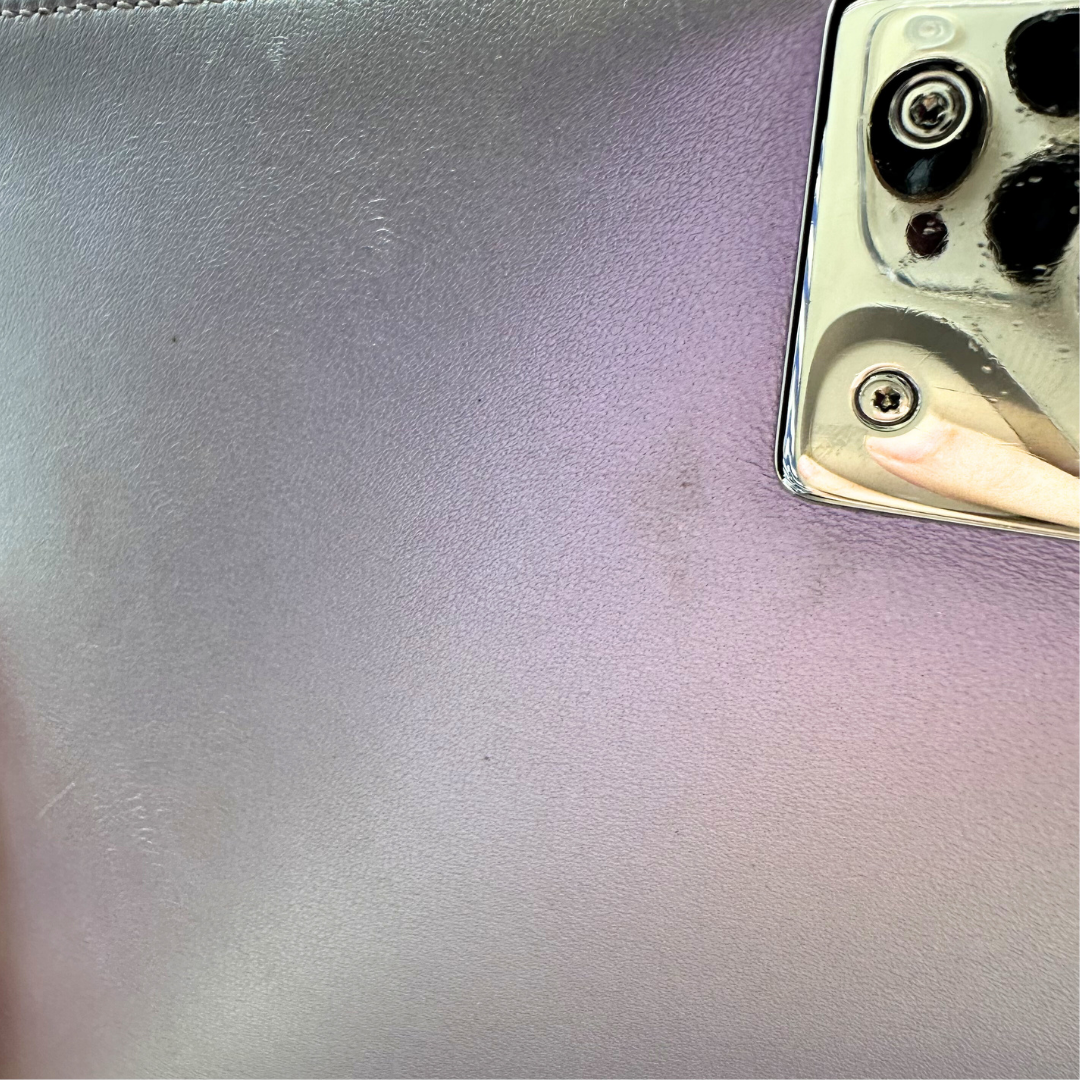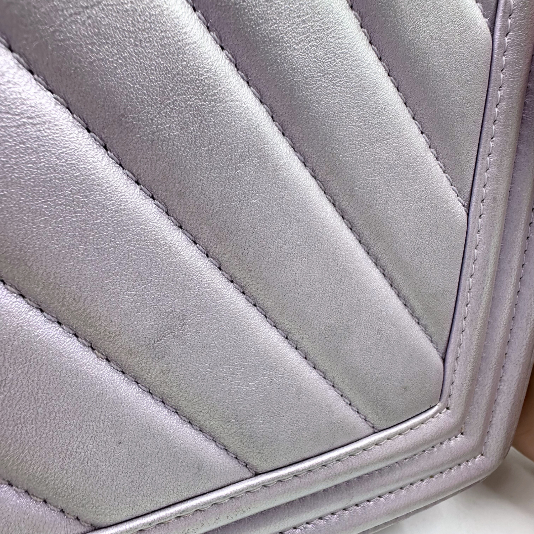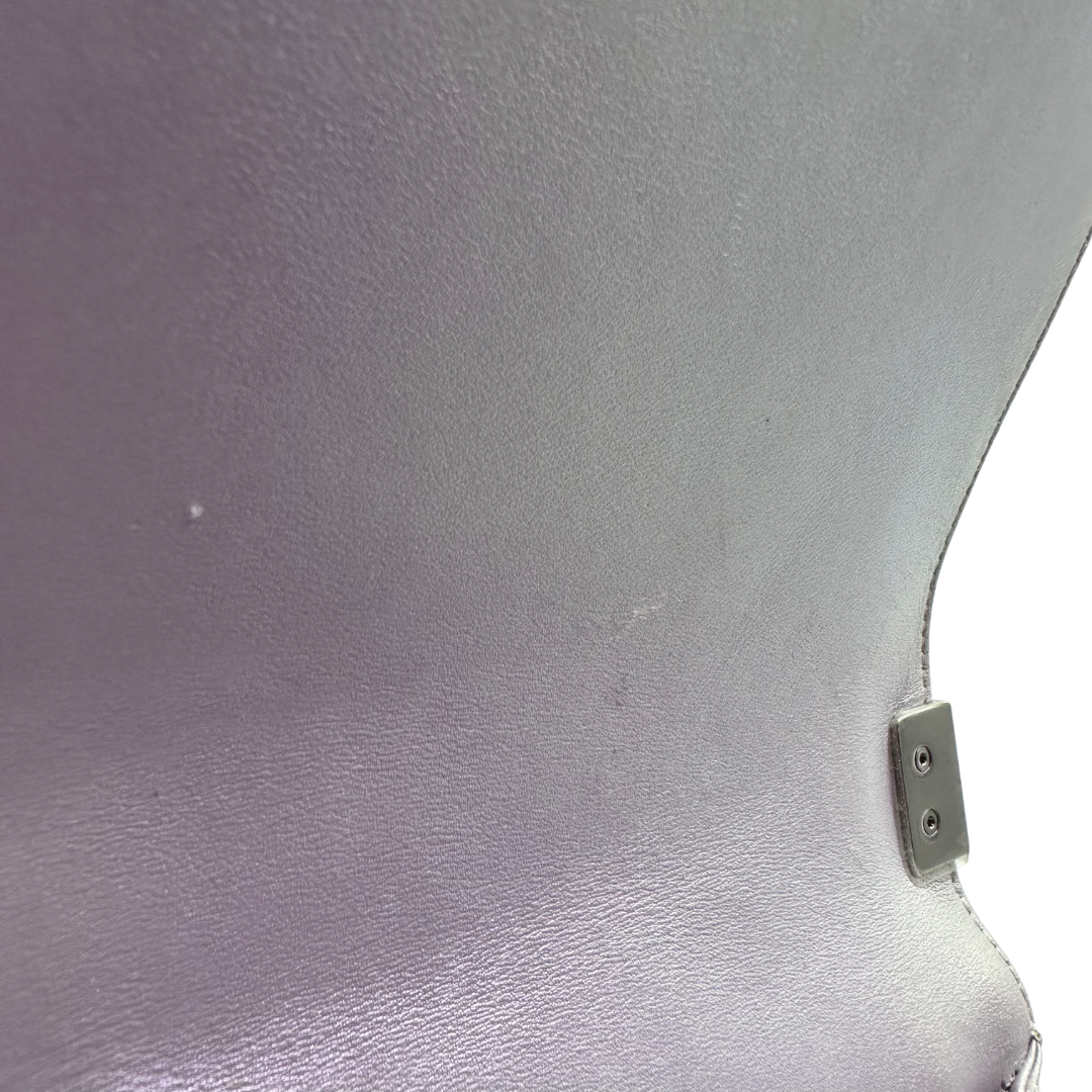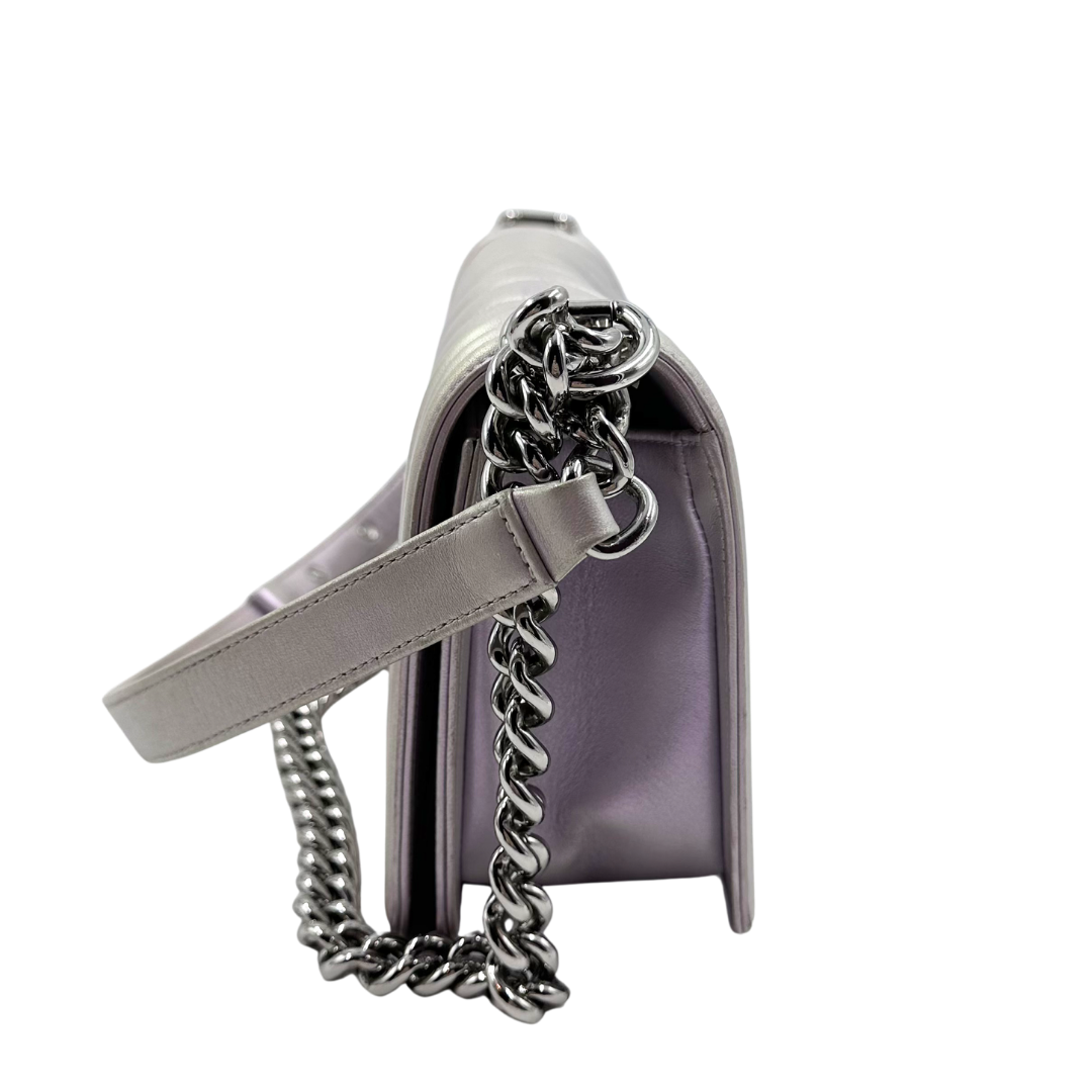 Iridescent lilac lambskin with silver hardware and iconic CC push lock closure. This Chanel Chevron Boy Bag combines luxe craftsmanship with timeless design—perfect for adding an elegant pop of color to any outfit.