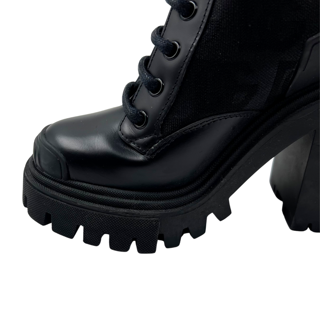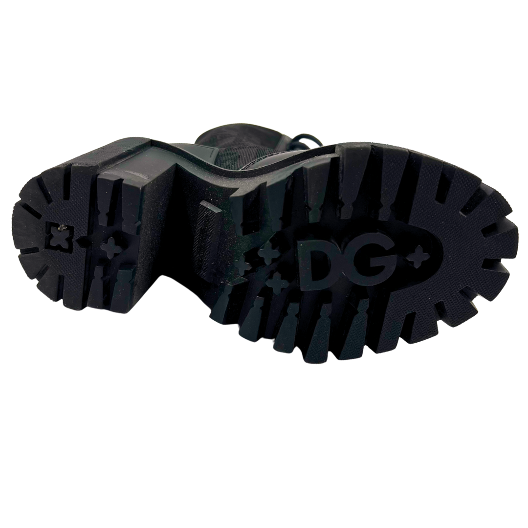 These Dolce & Gabbana black leather boots feature a block heel and lace-up detailing, as well as stretch material with the signature DG logo pattern on the sides, combining comfort with distinctive design.
