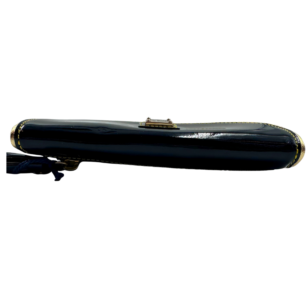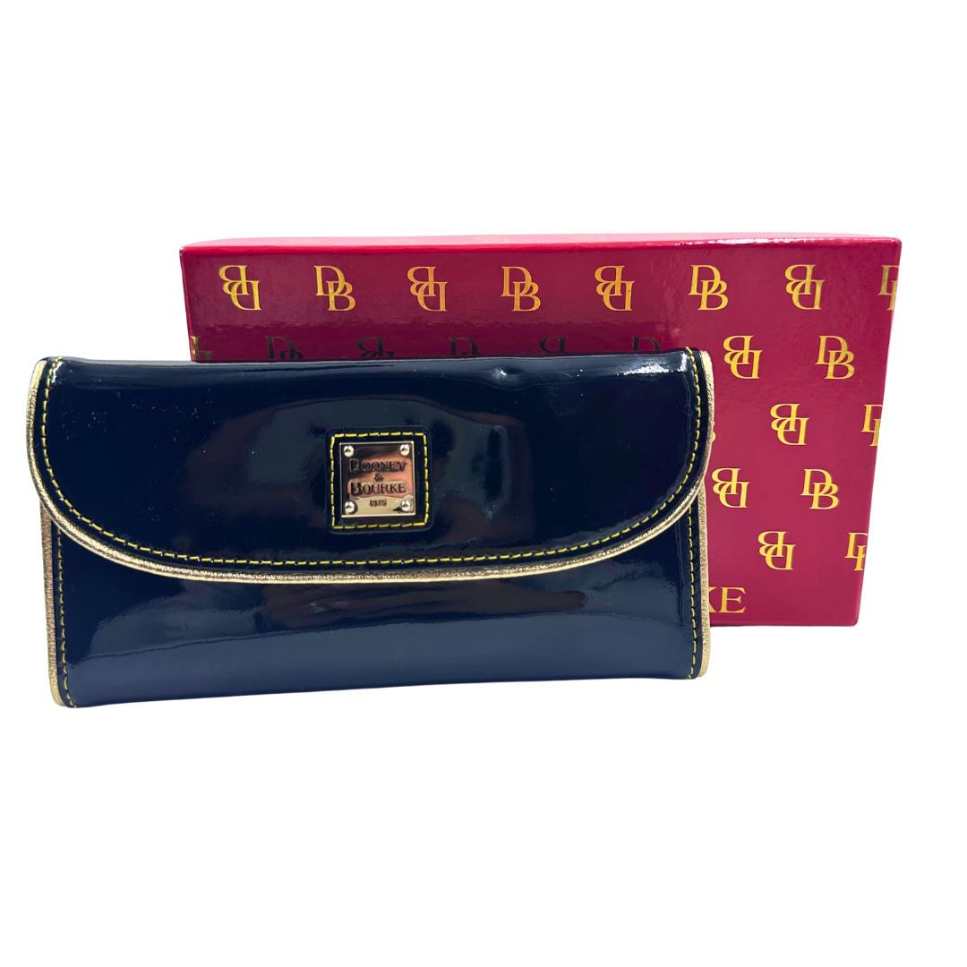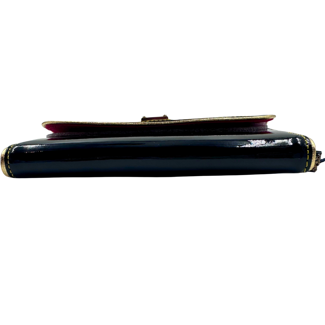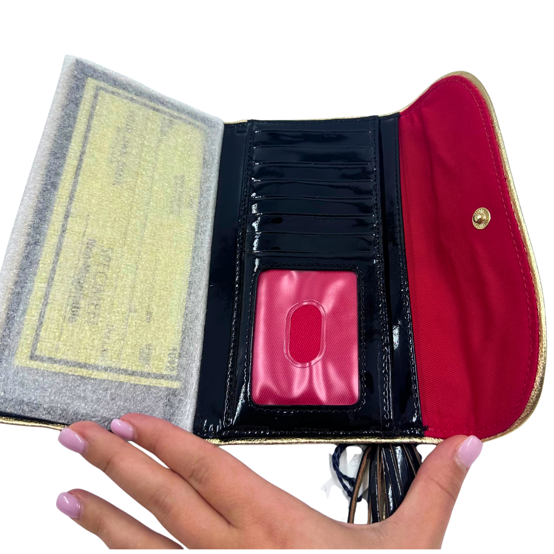 Sophisticated black patent leather wallet featuring lustrous gold hardware and a button snap closure for secure fastening. The back zip pocket with decorative tassel detail adds functional elegance and easy access to frequently used items.