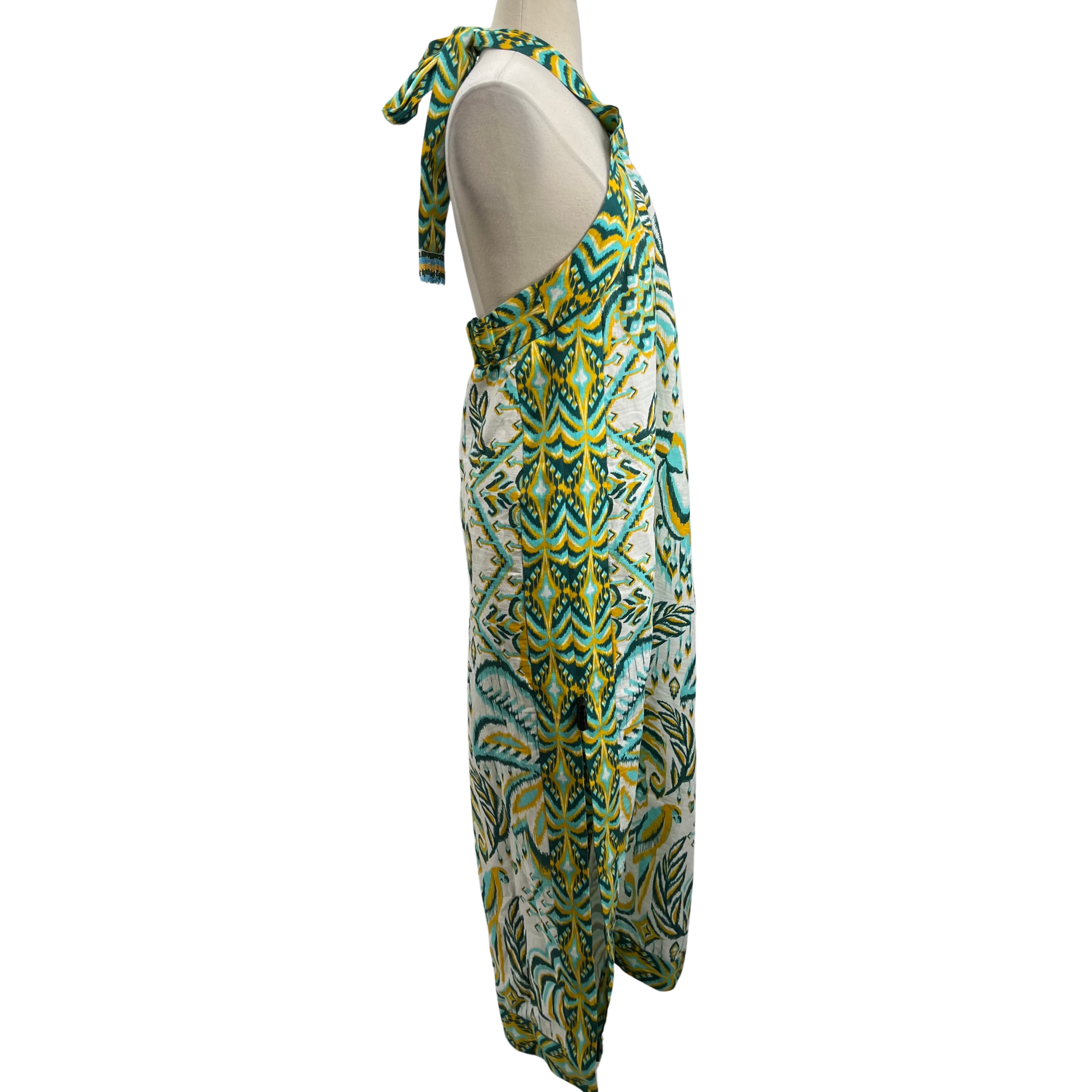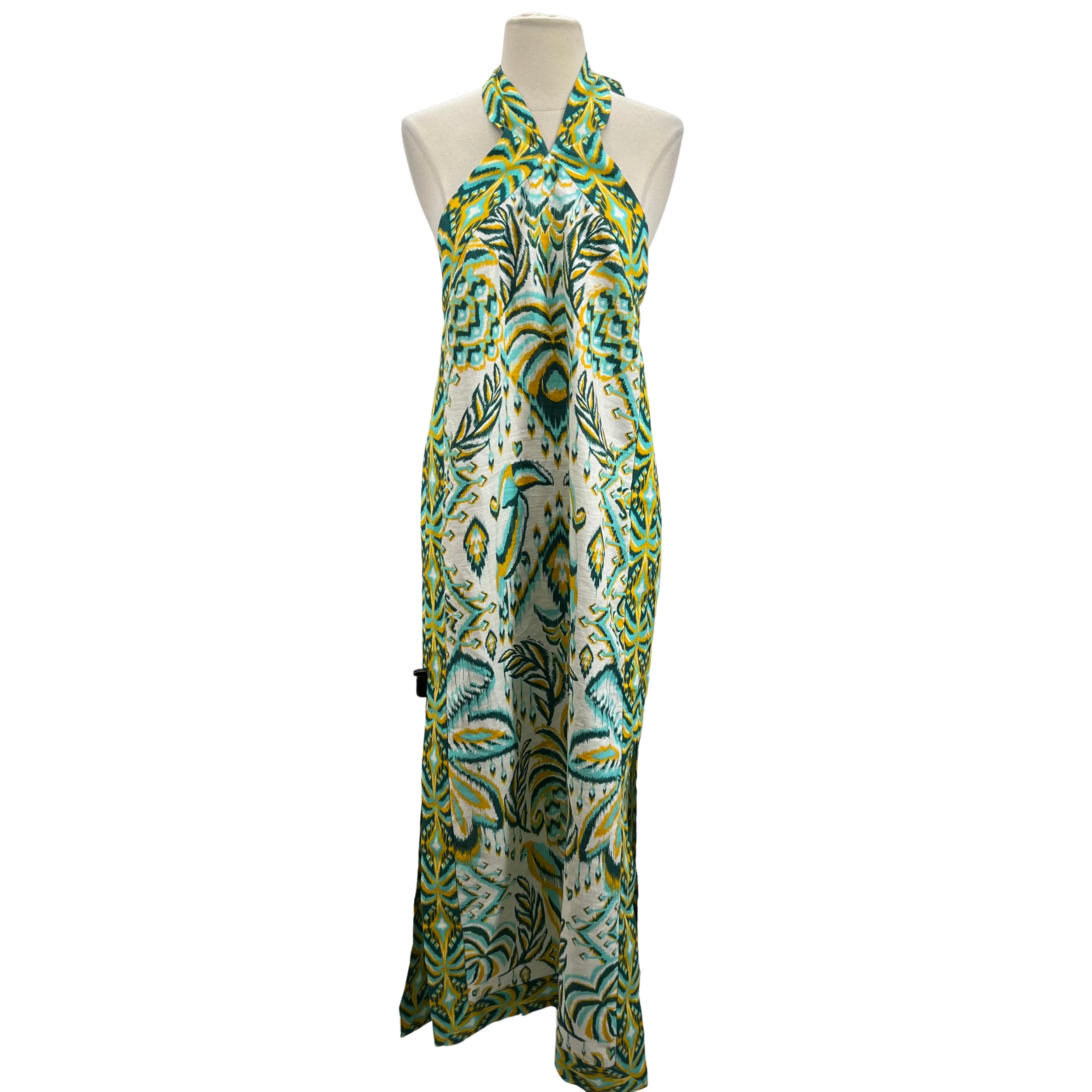 Stunning Farm Rio maxi dress in blue multi featuring an elegant halter neckline adorned with intricate beading. This size L piece showcases the brand's signature vibrant aesthetic with a sophisticated silhouette perfect for special occasions or elevated everyday wear. The beaded halter detail adds a touch of glamour and movement to this timeless design.