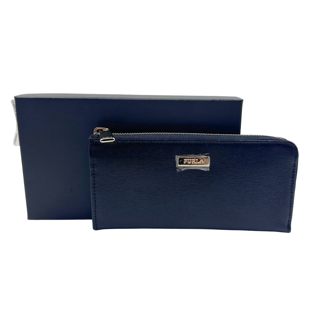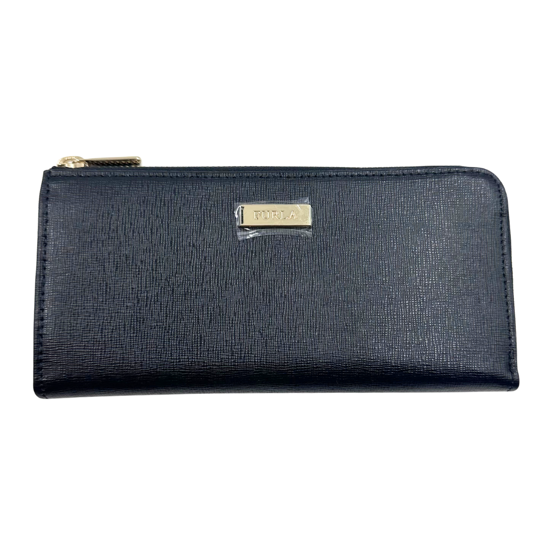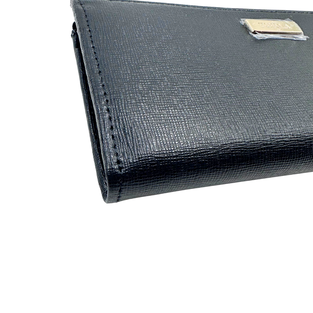 Sleek zip-around wallet in black saffiano leather, offering complete security with its full-perimeter zipper and convenient top zip entry. The textured leather resists scratches while maintaining a refined appearance, complemented by gleaming gold hardware. An organized essential that balances practicality with Italian sophistication.