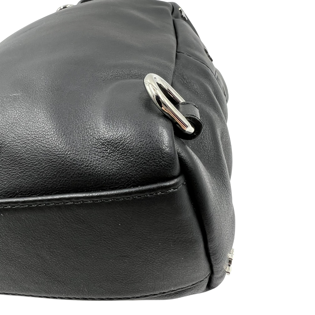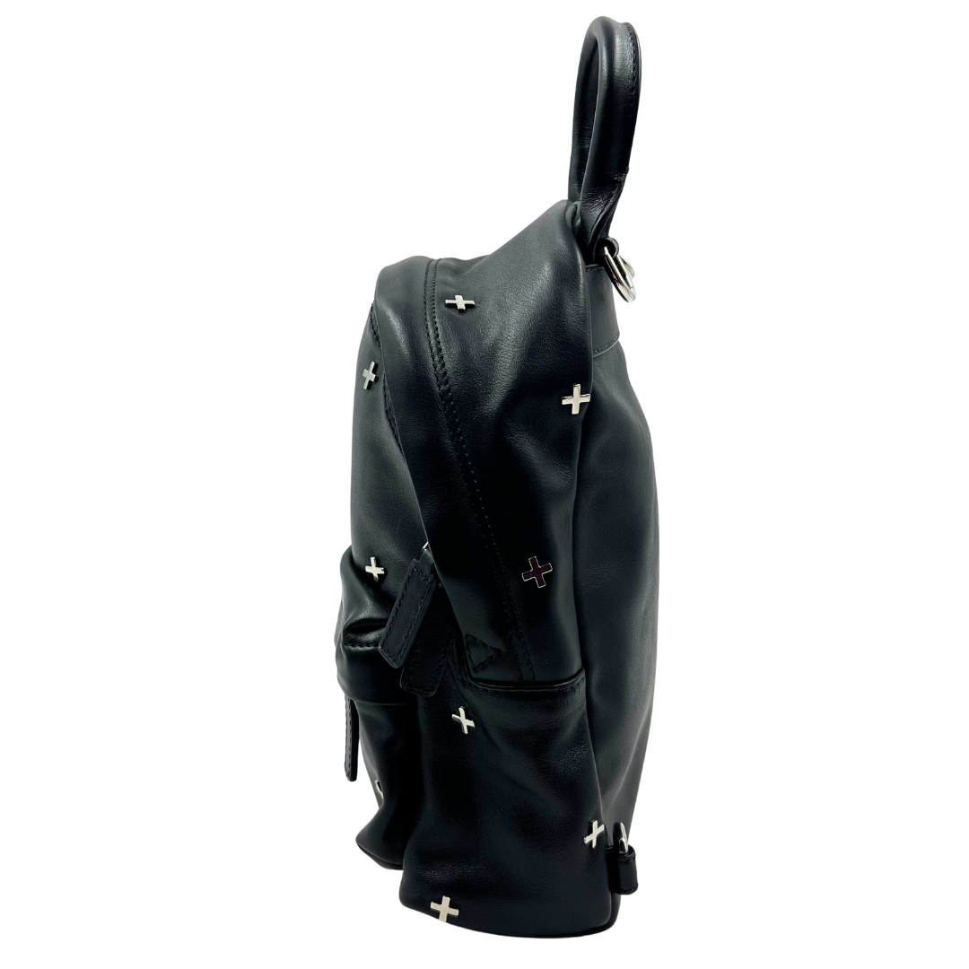 The Givenchy backpack is crafted from black leather and features silver hardware, zip closures, and distinctive cross stud details for a sleek, edgy look.