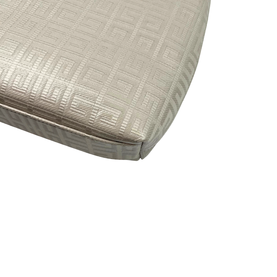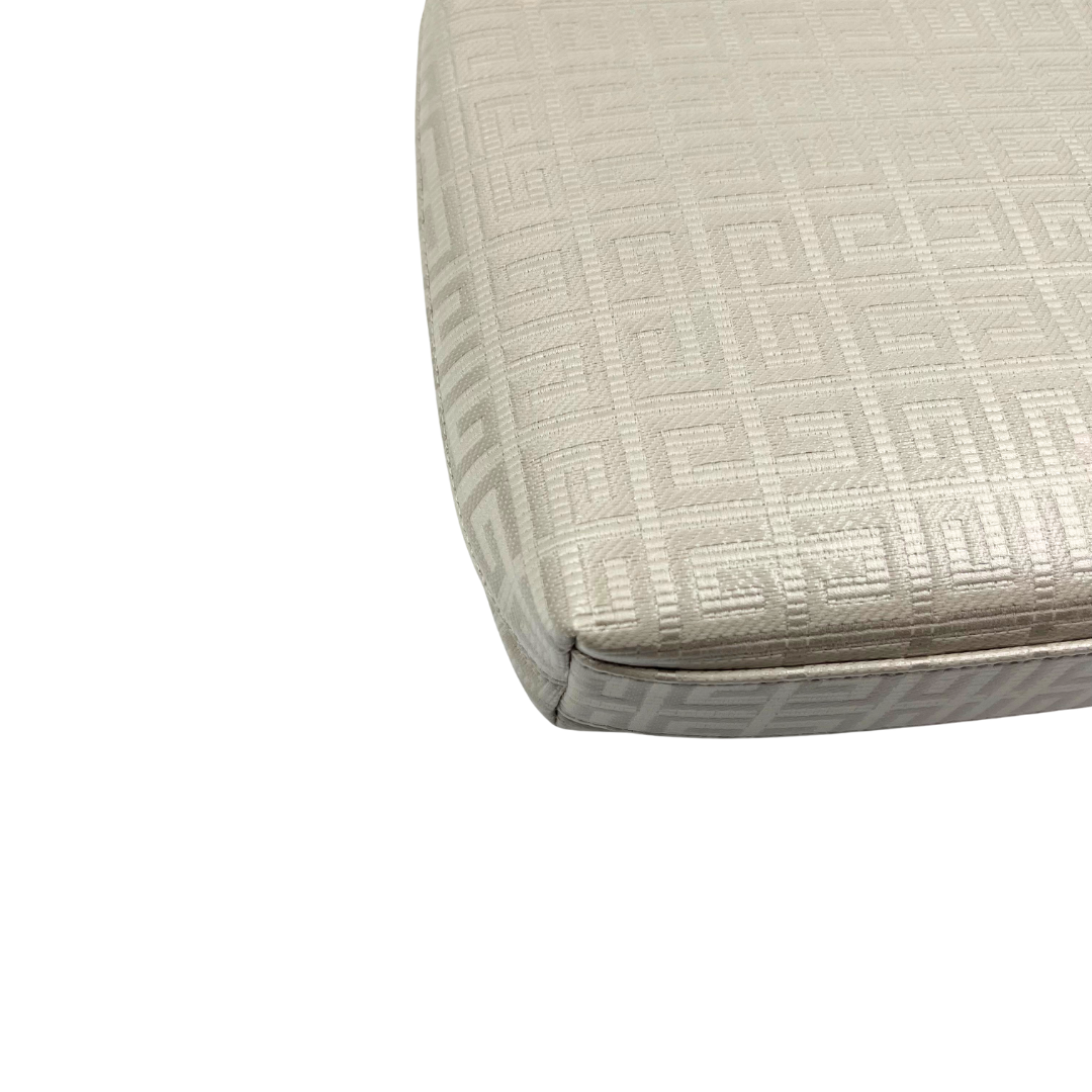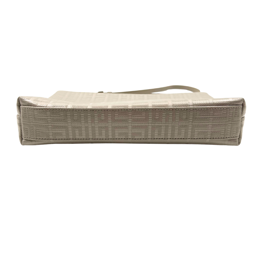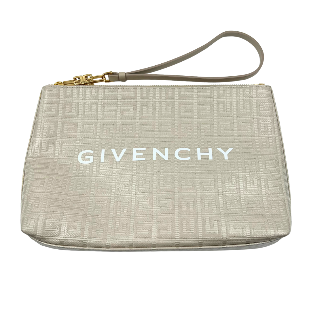 This Givenchy clutch features beige coated canvas with a logo across the front, gold hardware accents, and a top zip entry for secure and stylish carry.