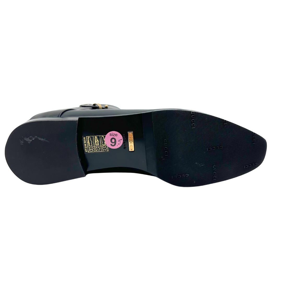 Step into luxury with these Gucci black leather booties, featuring refined gold hardware and a side zip entry ensures effortless styling. The almond toe silhouette flatters the foot. A non-slip sole provides reliable traction and stability, making these booties both elegant and practical for year-round wear.